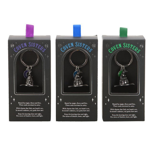 Share a little magic wherever you go with this set of 3 Coven Sisters metal witch hat keyrings, each featuring a crescent moon charm in a different colour- blue, purple, and green. Ideal for gifting to your coven, each keyring comes in spellbinding packaging with a witchy poem. Designed by Something Different Wholesale and part of The Coven Club collection of witchy gifts and home décor.
