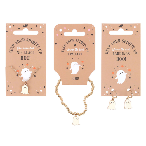 This set of glow-in-the-dark ghost jewellery includes a necklace, bracelet and pair of ghoulish earrings that are perfect for adding a spooky touch to an outfit or sneaking into Halloween treat bags. Designed by Something Different Wholesale and part of the Sweet and Spooky collection of Halloween gifts and ghost home decor.
