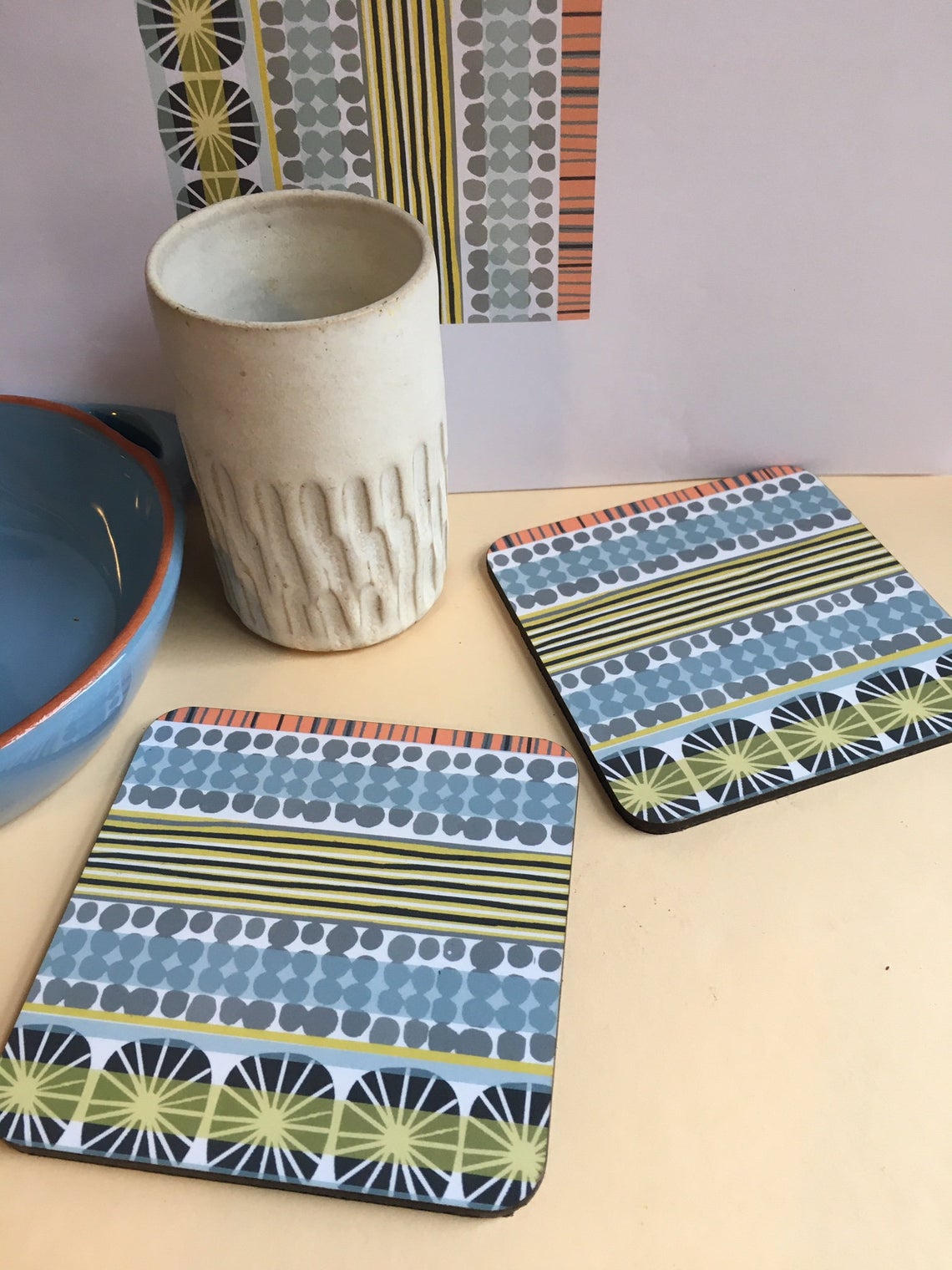 I design all the prints myself and the coasters are made in the uk, they have a lovely matt finish & a good quality cork backing size is 10cm x 10cm square.