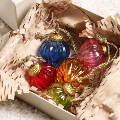 A sweet set of 5 miniature sultan glass baublesIn an array of bright retro colours like red and greenIdeal for adorning smaller trees or festive spacesDimensions: box width 11.5cm x height 6.5cm x depth 11.5cm bauble width 4cm x (hanging) height 12cm x depth 4cmMade from: glass, metal, card