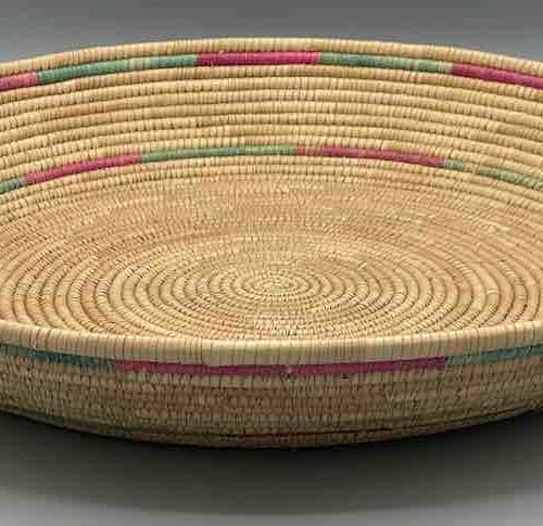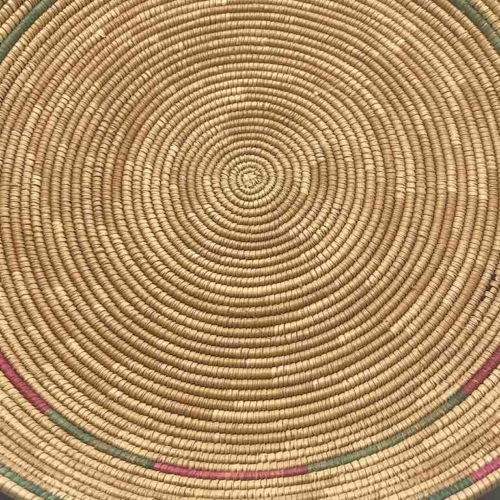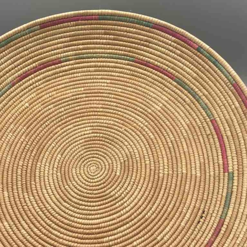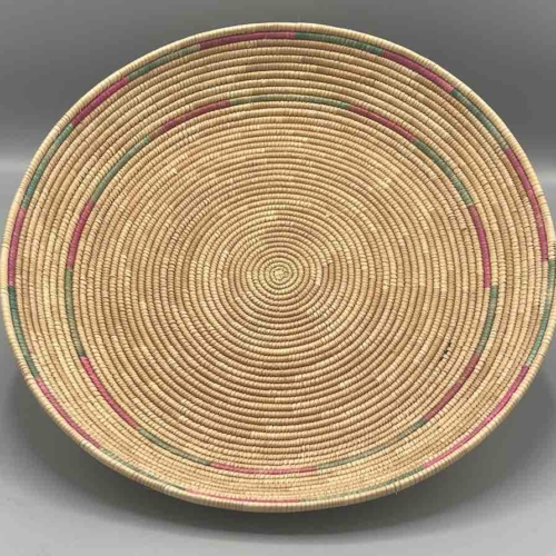 This fine quality medium coil shallow Fulani basket is commonly used in markets for the display of goods women sell, primarily spices and food items. 14 3/4″ diameter x 2 1/4″ depth (37.5 x 6 cm)