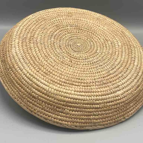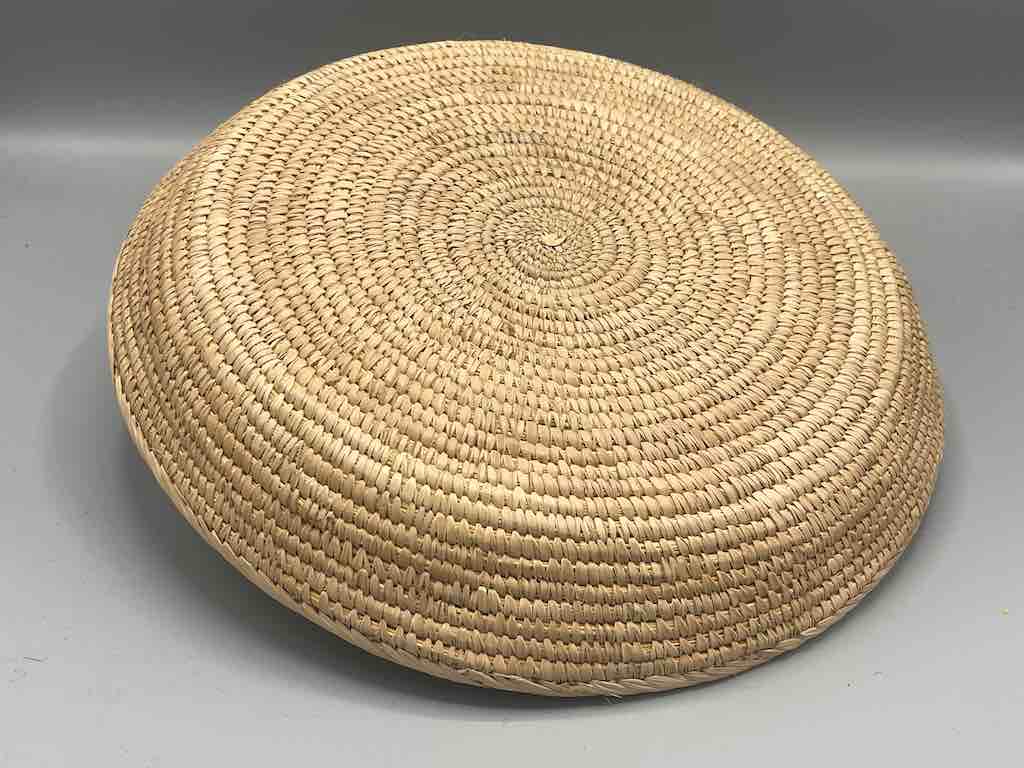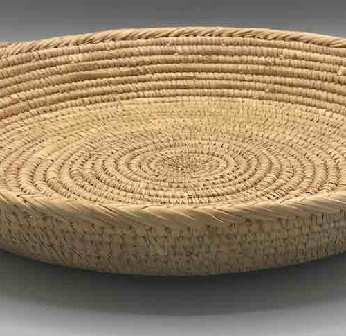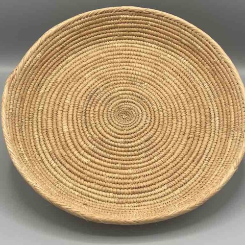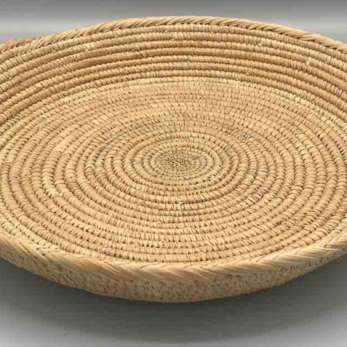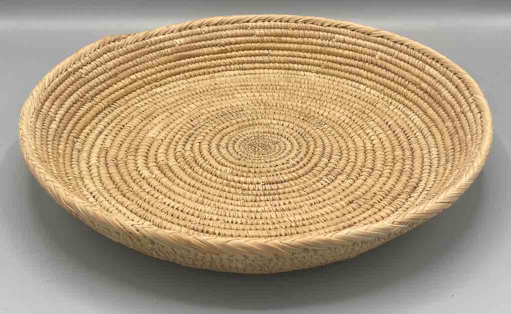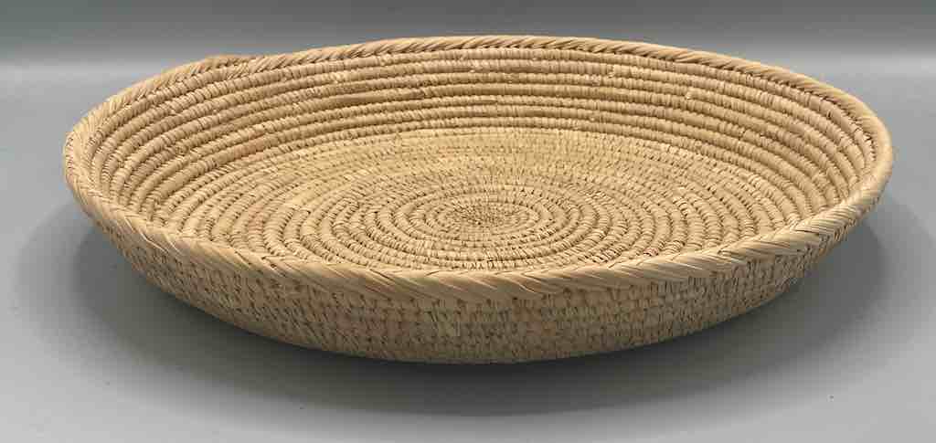 This fine quality medium coil shallow Fulani basket is commonly used in markets for the display of goods women sell, primarily spices and food items. This undecorated basket has a very beautifully woven rim. 14 3/8″ diameter x 2 1/4″ depth (36.5 x 6 cm)
