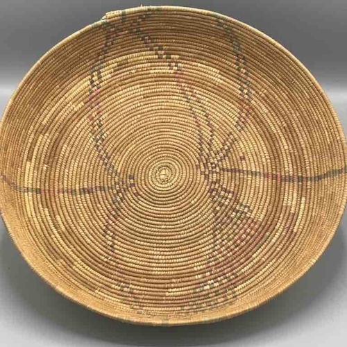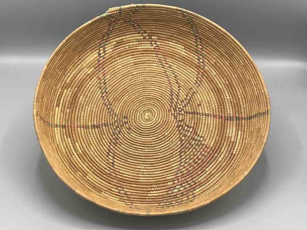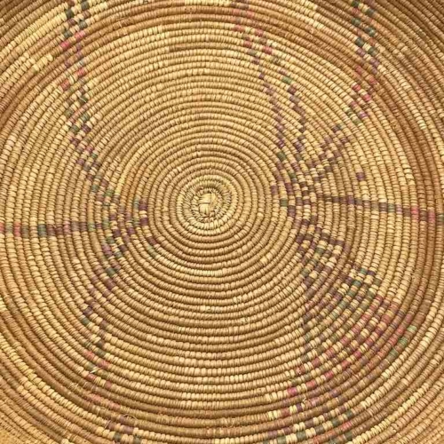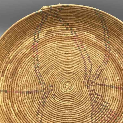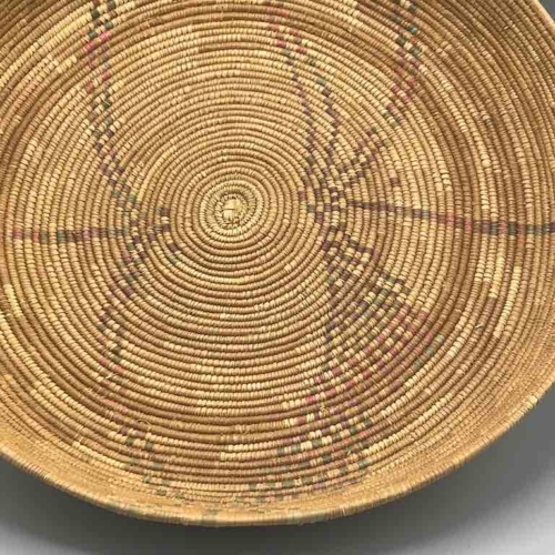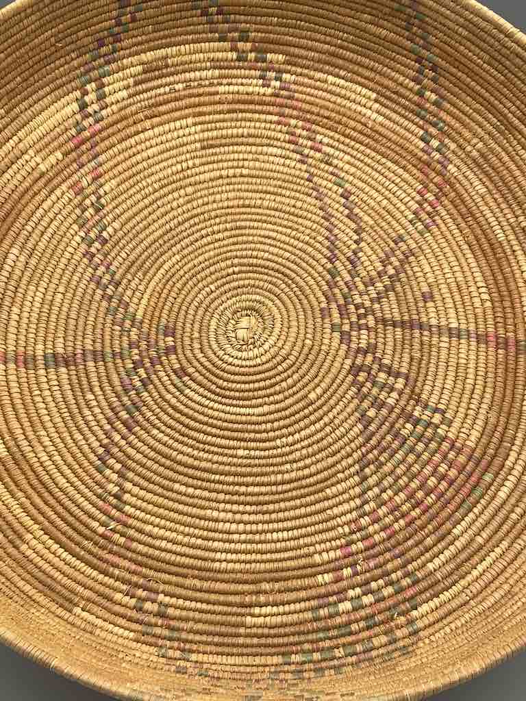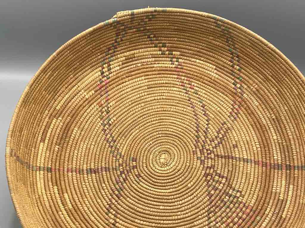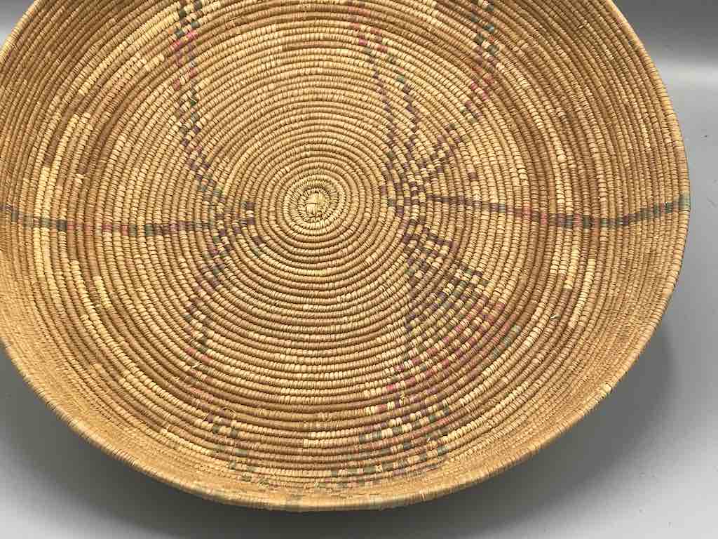 This fine quality medium coil shallow Fulani basket is commonly used in markets for the display of goods women sell, primarily spices and food items. This vintage basket has very sophisticated and beautiful decorations and its coils are the smallest and most tightly woven establishing its very high quality among woven baskets. 14 5/8″ diameter x 2 3/8″ depth (37 x 6 cm)