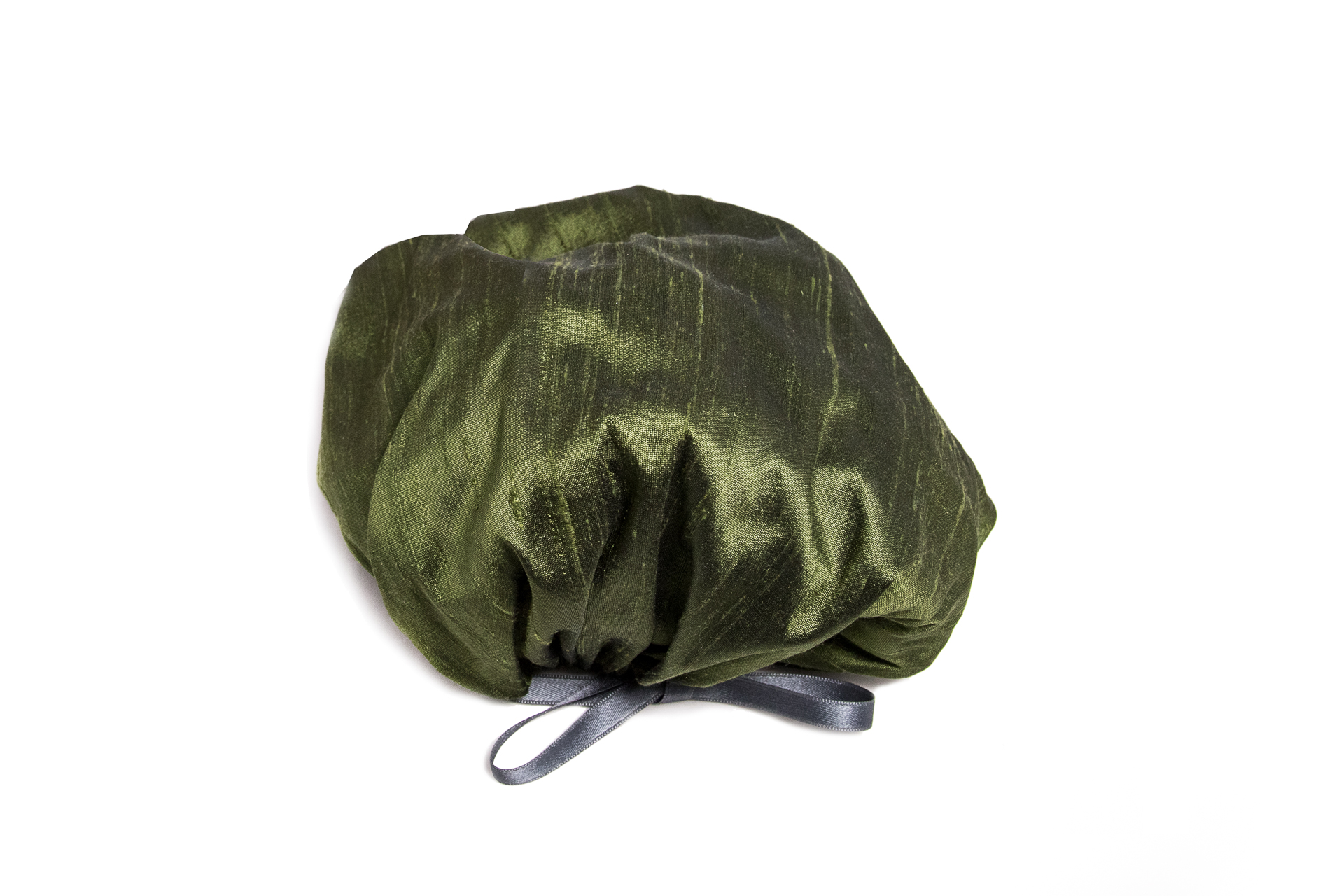 This silk hood keeps the hairstyle overnight. Simply pull the turban over your hair at bedtime to prevent knots and electrostatic build-up due to friction. The item is made by hand from shantung silk, a coarse but especially valuable silk material derived from so-called double cocoons.