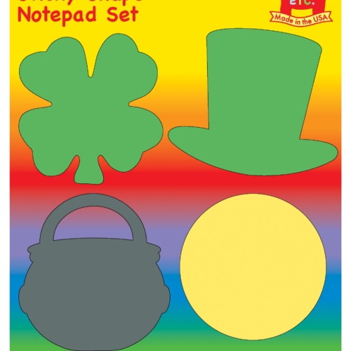 Add a unique and creative touch to any message with this St. Patrick’s Day Sticky Notepad Set. Set includes four fun, holiday themed Sticky Shape Notepads for a total of 200 sticky sheets. Designs include: Four Leaf Clover, Cauldron/ Pot-of-Gold, Hat, and Coin. Each notepad is created from a 3″ x 3″ paper with approximately a half inch strip of adhesive per notepad. Great for self-reminders, messages, magazine and book markers, tags, planning and journaling, and much more!