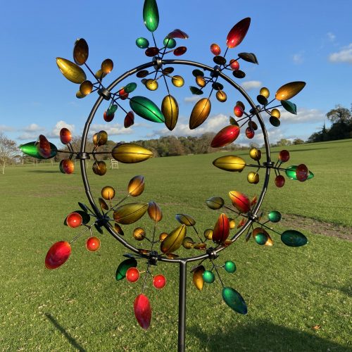 This beautiful wind spinner sculpture standing at 2.4m tall will provide a real statement piece in your garden with its autumnal multi-coloured leaves with shadowing. The wind sculpture has 10 sets of leaves with each set moving independently in the breeze. Not only is it an eye catching addition as it gently turns in the breeze to provide movement to your garden but it is strong & sturdy with its powder coated finish to keep it from weathering & making the wind sculpture resistant to scratching. This statement piece outdoor wind sculpture includes a strong ground stake so that it will be securely fixed into the ground whether windy or raining. It is the perfect addition to any garden.