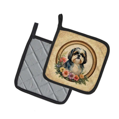 Pair of Pot Holders featuring breed specific Shih Tzu artwork. A Pair of Pot Holders to match your kitchen decor. Made in the USA these are thick and functional. Full color artwork decorates the front polyester fabric of the hot pad and accented by a black trim. Use these at as a trivet for your Thanksgiving or Christmas tablescape. Filled with insulated fabric and quilted for durability. These colorful pot holders will make a great gift for your favorite home cook or executive chef. Each pot holder measures approximately 7 1/2 inches by 7 1/2 inches. A hanging tab is included.