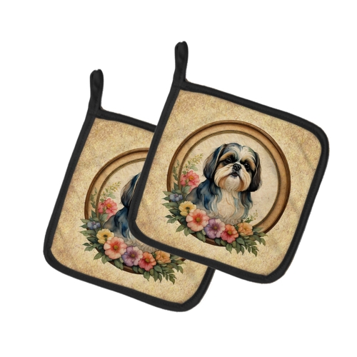 Pair of Pot Holders featuring breed specific Shih Tzu artwork. A Pair of Pot Holders to match your kitchen decor. Made in the USA these are thick and functional. Full color artwork decorates the front polyester fabric of the hot pad and accented by a black trim. Use these at as a trivet for your Thanksgiving or Christmas tablescape. Filled with insulated fabric and quilted for durability. These colorful pot holders will make a great gift for your favorite home cook or executive chef. Each pot holder measures approximately 7 1/2 inches by 7 1/2 inches. A hanging tab is included.