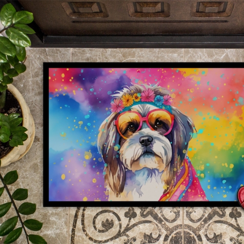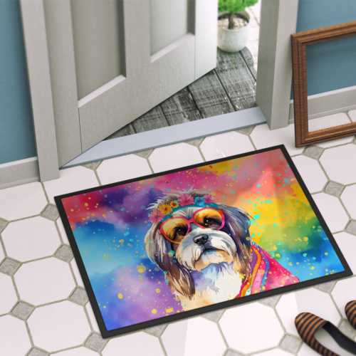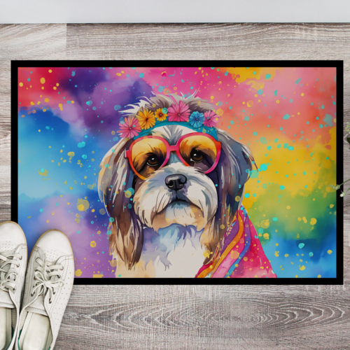 Doormat featuring breed specific Shih Tzu artwork. Welcome your guests in style with our Artwork Door Mat, designed to withstand almost any weather condition. This mat, measuring approximately 24 by 36 inches, is held together by durable black binding tape. Its top layer, composed of polyester felt, is dyed with the eye-catching image you see on the mat. A few layers below provide the mat with stability, while its rubber bottom is stamped to help prevent slipping and ensures safety. Our mat works wonderfully as both an indoor or outdoor door mat. For cleaning, simply hose it off with water or use a power washer – no need for any cleaner that produces suds. Avoid scrubbing with a brush, instead, opt for the vacuum on floor setting. Designed manufactured and printed in the USA, this mat is a perfect addition to your porch, outdoor kitchen, entryway, or any indoor space. Its unique design makes it a charming decorative rug that greets your guests and adds a stylish touch to your home decor.