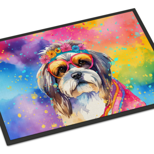 Doormat featuring breed specific Shih Tzu artwork. Welcome your guests in style with our Artwork Door Mat, designed to withstand almost any weather condition. This mat, measuring approximately 24 by 36 inches, is held together by durable black binding tape. Its top layer, composed of polyester felt, is dyed with the eye-catching image you see on the mat. A few layers below provide the mat with stability, while its rubber bottom is stamped to help prevent slipping and ensures safety. Our mat works wonderfully as both an indoor or outdoor door mat. For cleaning, simply hose it off with water or use a power washer – no need for any cleaner that produces suds. Avoid scrubbing with a brush, instead, opt for the vacuum on floor setting. Designed manufactured and printed in the USA, this mat is a perfect addition to your porch, outdoor kitchen, entryway, or any indoor space. Its unique design makes it a charming decorative rug that greets your guests and adds a stylish touch to your home decor.