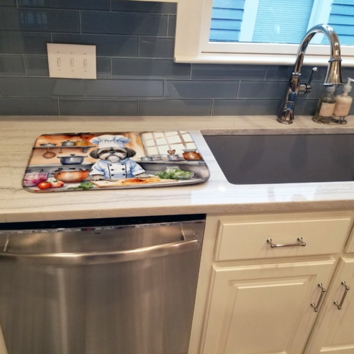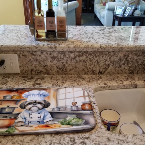 Dish Drying Mat featuring breed specific Shih Tzu artwork. Say goodbye to messy countertops and soggy dish towels with our innovative dish drying mat. Our high-quality dish drying pad is designed to keep your countertops dry while offering a stylish and efficient solution. Whether you’re air drying dishes, glasses, stemware, silverware, pots, pans, bottles, or even fruits and vegetables, our dish mat is the perfect choice. The 14 inches x 22 inches size fits most counters and dish drying racks, and the non-slip design ensures stability. Made with water-absorbent polyester and a polyurethane foam insert, our dish drying mat is not only functional but also durable. It’s machine washable and printed in the USA for long-lasting use. The beautiful artwork adds flair to your kitchen decor, making it a perfect housewarming gift or present for any occasion. Upgrade your kitchen experience with our absorbent and versatile dish drying mat.
