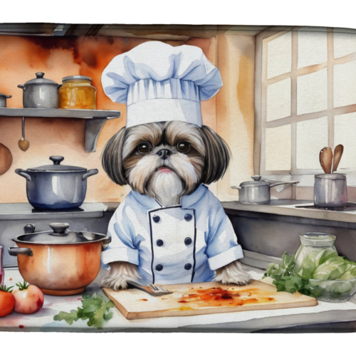 Dish Drying Mat featuring breed specific Shih Tzu artwork. Say goodbye to messy countertops and soggy dish towels with our innovative dish drying mat. Our high-quality dish drying pad is designed to keep your countertops dry while offering a stylish and efficient solution. Whether you’re air drying dishes, glasses, stemware, silverware, pots, pans, bottles, or even fruits and vegetables, our dish mat is the perfect choice. The 14 inches x 22 inches size fits most counters and dish drying racks, and the non-slip design ensures stability. Made with water-absorbent polyester and a polyurethane foam insert, our dish drying mat is not only functional but also durable. It’s machine washable and printed in the USA for long-lasting use. The beautiful artwork adds flair to your kitchen decor, making it a perfect housewarming gift or present for any occasion. Upgrade your kitchen experience with our absorbent and versatile dish drying mat.