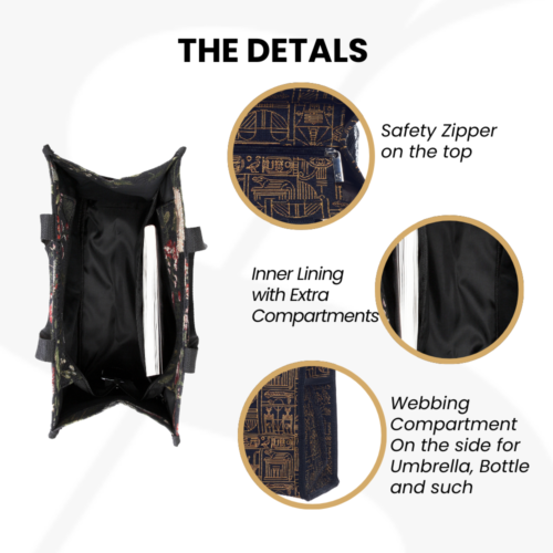 Pair of full width pockets located on both sides of the shopper; one is fastened with a zip and the other with velcro for a stylish variation and easy access