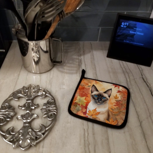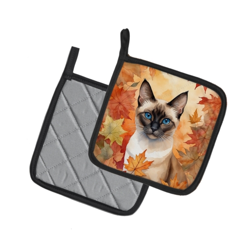 Pair of Pot Holders featuring breed specific Siamese artwork. A Pair of Pot Holders to match your kitchen decor. Made in the USA these are thick and functional. Full color artwork decorates the front polyester fabric of the hot pad and accented by a black trim. Use these at as a trivet for your Thanksgiving or Christmas tablescape. Filled with insulated fabric and quilted for durability. These colorful pot holders will make a great gift for your favorite home cook or executive chef. Each pot holder measures approximately 7 1/2 inches by 7 1/2 inches. A hanging tab is included.