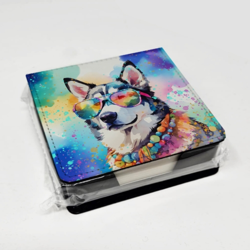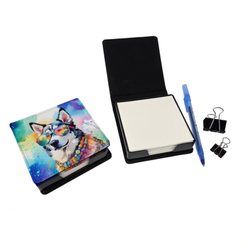 PU Leather Note Paper Holder featuring breed specific Siberian Husky artwork. Elevate your workspace with this PU Leather Note Paper Holder, crafted to resemble luxurious leather without the use of animal products. Made from durable synthetic PU leather, it offers both a premium look and eco-friendly appeal. This note holder, compactly sized at 4.25 x 4.25 x 1.25 inches, includes about 160 sheets of 3.75 x 3.75-inch note paper—ideal for quick notes and reminders. An exclusive artist-designed cover makes each holder uniquely vibrant, adding a splash of color and personality to any desk or office. The discrete design keeps note paper hidden, maintaining a neat and organized workspace. Perfect as a gift or for personal use, this stylish holder is refillable with standard paper, ensuring long-lasting utility. A must-have for anyone seeking a sophisticated, artful touch to their workspace while supporting animal-friendly products. Add style, organization, and creativity to your everyday routine with this elegant note paper holder.