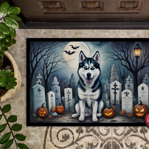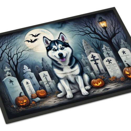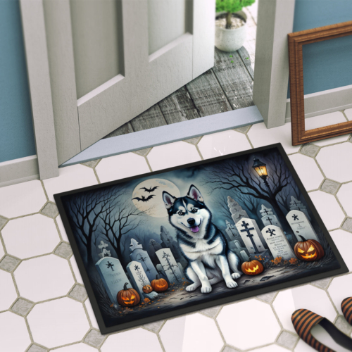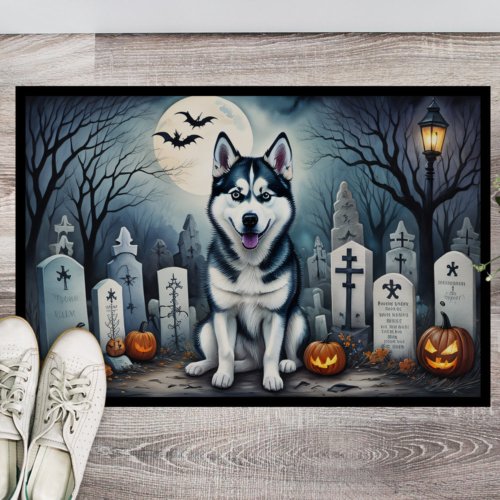 Doormat featuring breed specific Siberian Husky artwork. Celebrate Halloween with this Halloween Doormat. Welcome your guests in style with our Artwork Door Mat, designed to withstand almost any weather condition. This mat, measuring approximately 24 by 36 inches, is held together by durable black binding tape. Its top layer, composed of polyester felt, is dyed with the eye-catching image you see on the mat. A few layers below provide the mat with stability, while its rubber bottom is stamped to help prevent slipping and ensures safety. Our mat works wonderfully as both an indoor or outdoor door mat. For cleaning, simply hose it off with water or use a power washer – no need for any cleaner that produces suds. Avoid scrubbing with a brush, instead, opt for the vacuum on floor setting. Designed manufactured and printed in the USA, this mat is a perfect addition to your porch, outdoor kitchen, entryway, or any indoor space. Its unique design makes it a charming decorative rug that greets your guests and adds a stylish touch to your home decor.