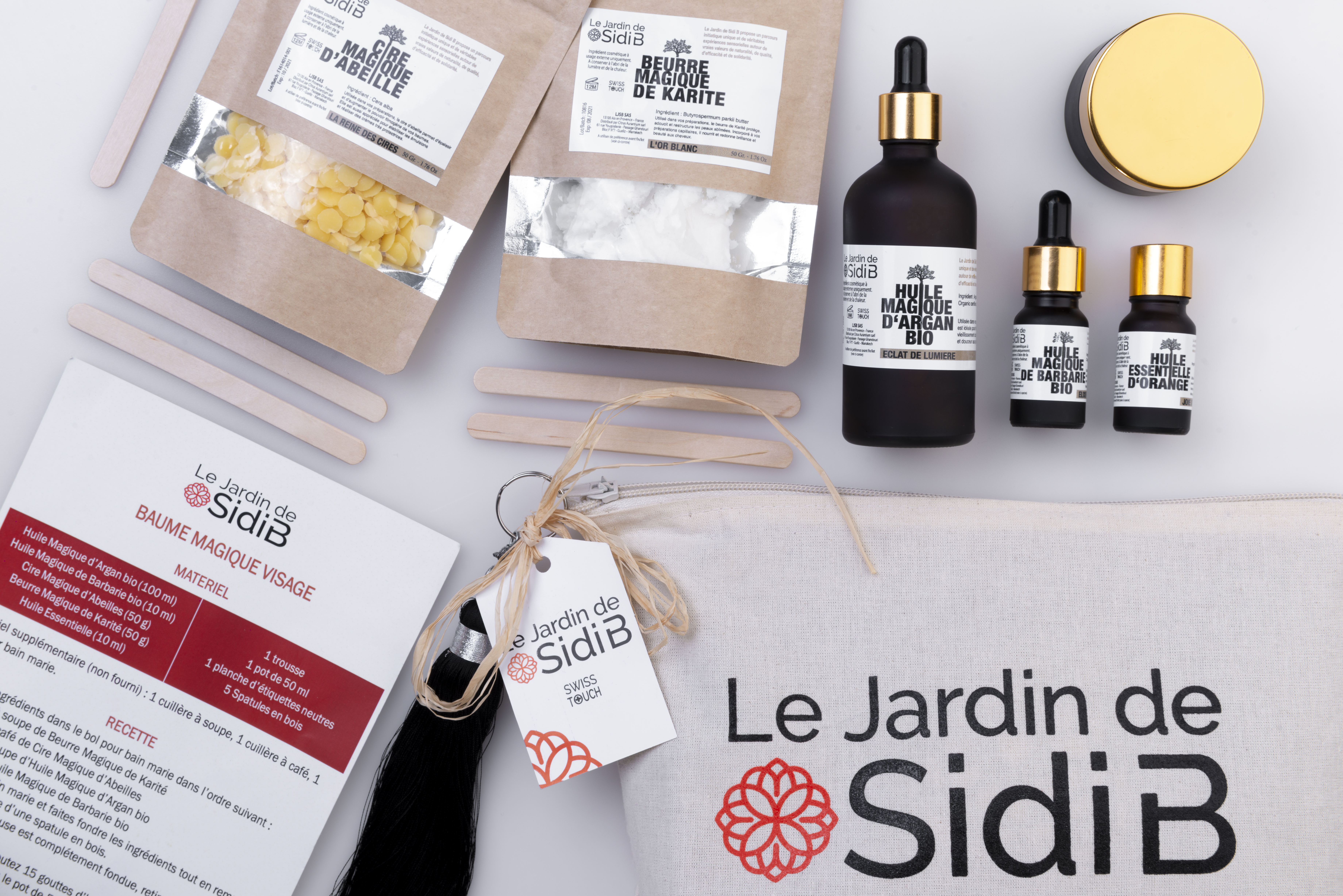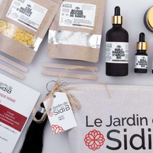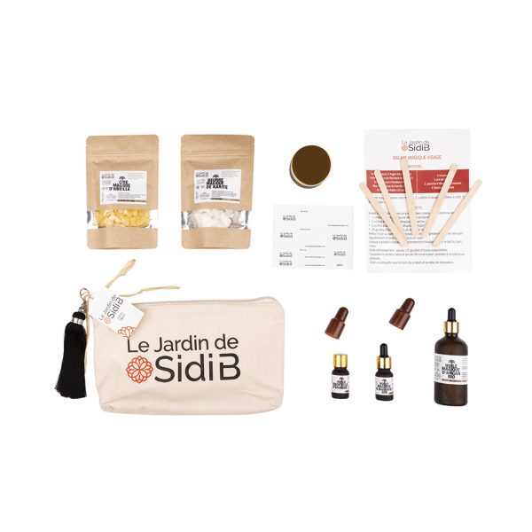 “Presented in a “hand made” cotton make-up kit, this home-made cosmetics box and its vegetable silk trimming pompom contains all the necessary ingredients, accessories and reusable packaging to design your own beauty rituals.