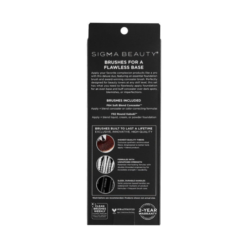 A complete complexion set, featuring a foundation brush and an Allure award-winning concealer brush. Brushes are easy to use for beauty lovers at any skill Includes an award-winning concealer brush and an essential foundation brush Allows you to create a beautiful, flawless base in minutes! Made with patented waterproof technology to ensure the handle and ferrule never separate over time Ultra-soft synthetic fibers better hold, apply, and blend all product formulas 100% cruelty-free and vegan Apply your favorite complexion products like a pro with this deluxe duo, featuring an essential foundation brush and award-winning concealer brush. Perfectly designed for beauty lovers at any skill level, this set has what you need to flawlessly apply foundation for an even base and buff concealer over dark spots, blemishes, or imperfections.HIGHEST-QUALITY FIBERS:Exclusive synthetic antimicrobial fibersEngineered to better hold, apply + blend productsFERRULES WITH UNMATCHED STRENGTH:Durable + corrosion-resistantPrecious metal plating for shine + strengthExclusive, patented interlocking technologyDouble-threaded engineeringSLEEK, DURABLE HANDLES:Solid polymer-based handles are waterproofOutlasts all product formulas + frequent brush careThis makeup brush set is 100% cruelty-free and vegan Products Included: F82 Round Kabuki™ F64 Soft Blend Concealer™