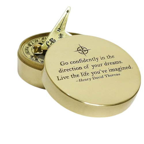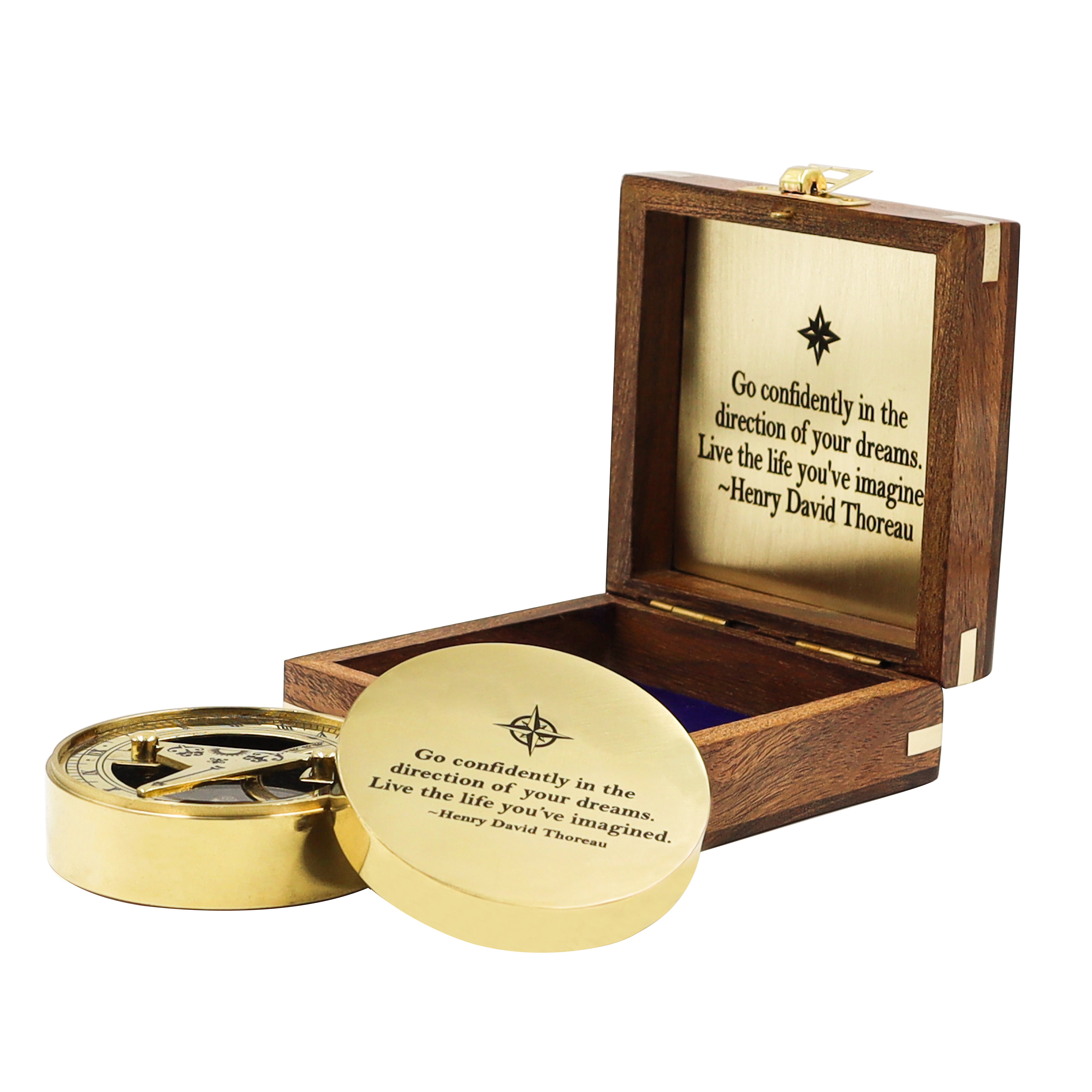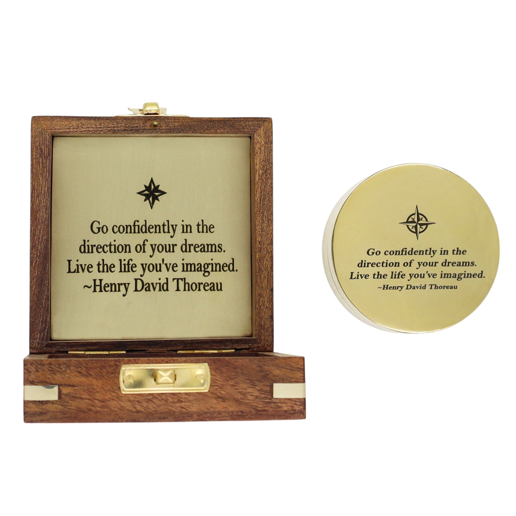 ▬ 𝗣𝗥𝗢𝗗𝗨𝗖𝗧 𝗗𝗘𝗧𝗔𝗜𝗟𝗦 ▬ This fully functional brass sundial compass comes with a famous quote by Henry David Thoreau: “Go Confidently in the Direction of your Dreams. Live the Life you have Imagined” The quote is engraved on the front of the compass and also included inside the wooden gift box.The compass comes plain by default. The images in the listing are just examples showing engraving styles and font. You can personalise the engraving text however you’d like. Dimensions: – Compass Size: 2.7 inches – 7 cm- Wooden Box Size: 3.9 inches x 3.9 inches – 10 cm x 10 cm Materials:- Brass, Glass