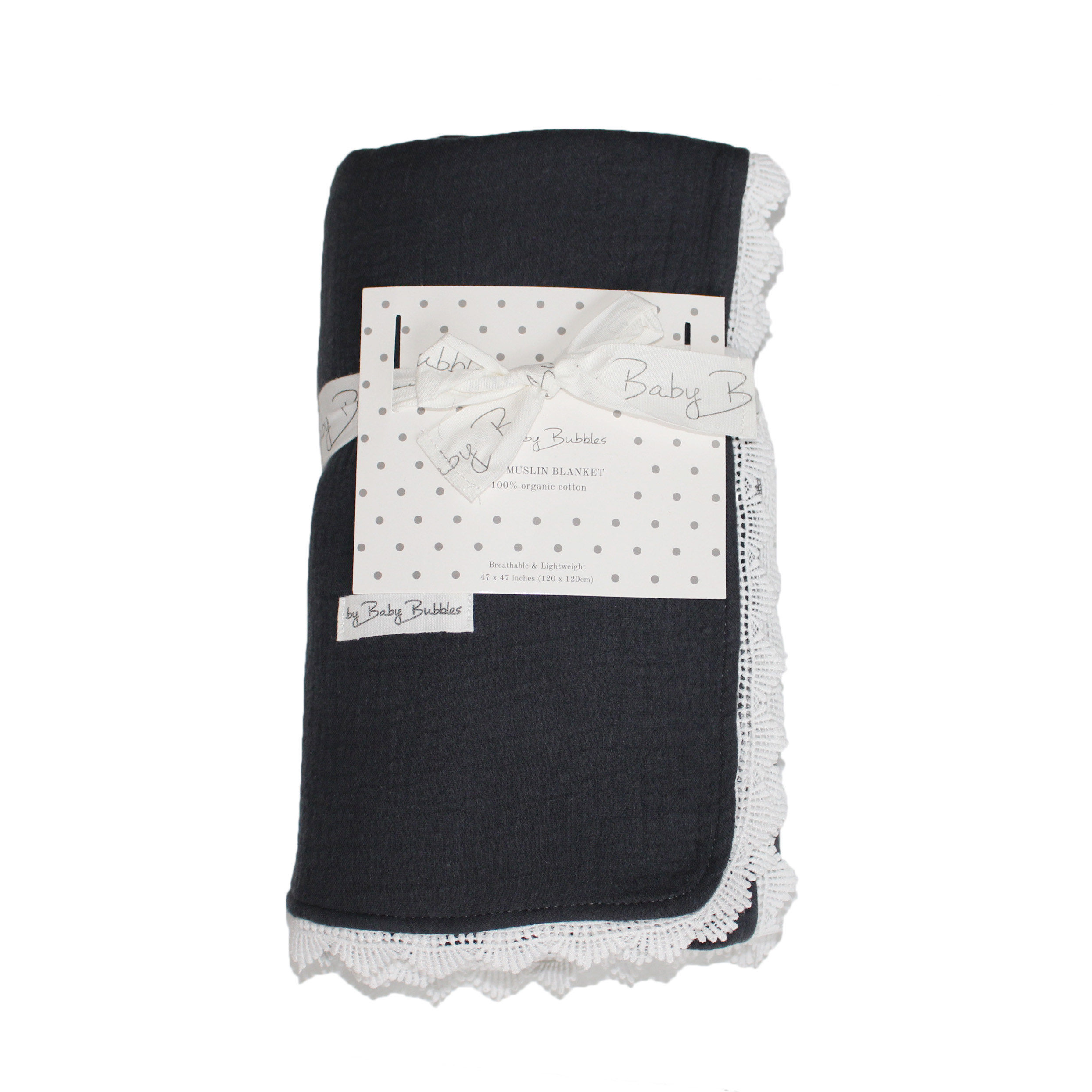 The luxurious muslin baby blanket with lace trim is made of 3-layers of super soft 100% GOTS certified organic cotton which is gentle and soft on baby’s delicate skin. The 3 double layers make it lightweight and breathable but still warm. The large size (120 x 120 cm) makes the blanket perfect to use as a crib blanket, stroller cover or play mat. The neutral muted colors make them perfectly gender neutral and an essential part of any nursery.