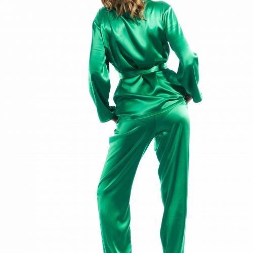 The extravagant pant suit in pajama style is sexy and very comfortable at the same time. The offset shoulder gives the blazer a certain lightness. The pants have a flexible waistband for ease of use.