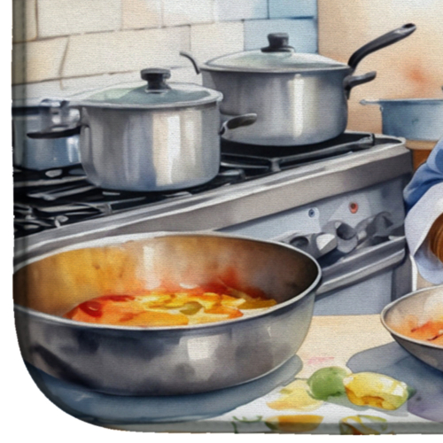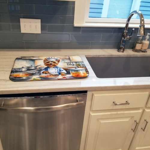 Dish Drying Mat featuring breed specific Silky Terrier artwork. Say goodbye to messy countertops and soggy dish towels with our innovative dish drying mat. Our high-quality dish drying pad is designed to keep your countertops dry while offering a stylish and efficient solution. Whether you’re air drying dishes, glasses, stemware, silverware, pots, pans, bottles, or even fruits and vegetables, our dish mat is the perfect choice. The 14 inches x 22 inches size fits most counters and dish drying racks, and the non-slip design ensures stability. Made with water-absorbent polyester and a polyurethane foam insert, our dish drying mat is not only functional but also durable. It’s machine washable and printed in the USA for long-lasting use. The beautiful artwork adds flair to your kitchen decor, making it a perfect housewarming gift or present for any occasion. Upgrade your kitchen experience with our absorbent and versatile dish drying mat.
