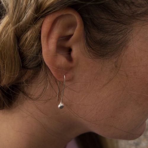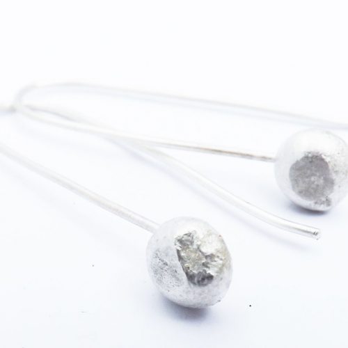 Really wearable, fused eco-silver drop earrings. They’re around 5mm diameter, drop around 15mm from the bottom of your ear-lobe and are a little bit un-even with texture with a few crevices like the moon… You can order them in clean, satin finish eco-silver, a bit oxidised to bring out the markings a bit or even in eco-gold. All my jewellery is gift-wrapped in tissue or recycled giftboxes What is ecosilver? Eco-silver is a green alternative to sterling silver. It is a little bit more expensive but has the same silver content as sterling, it’s just made of 100% recycled and scrap silver products. Eco Silver can be both treated and worked with in the same way as silver, for the same quality results but more environmentally friendly. Produced from scrap jewellery, medical equipment, electronics and giftware, all the eco silver I use comes with a certificate of authenticity and is hallmarked if it is the required weight.