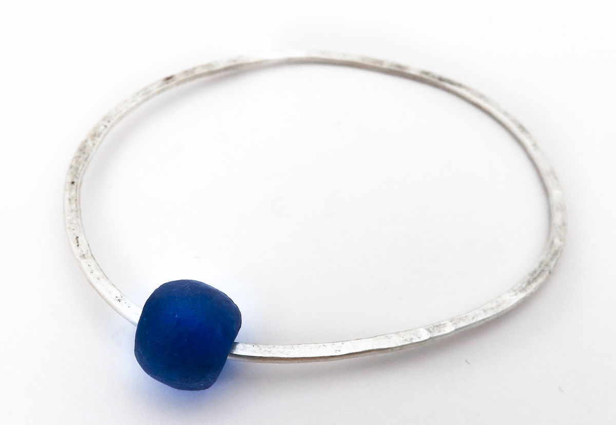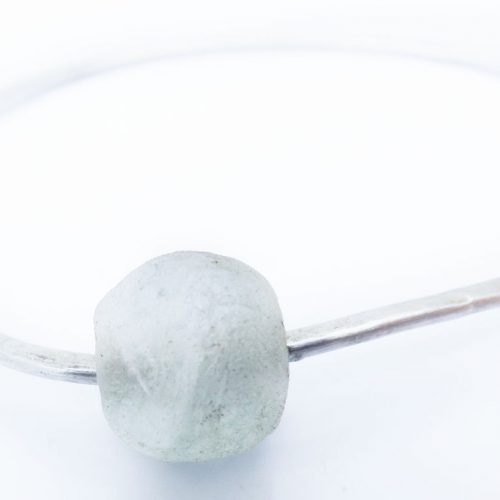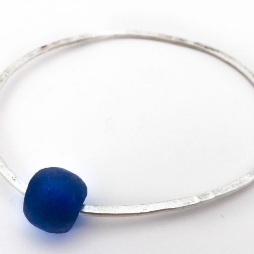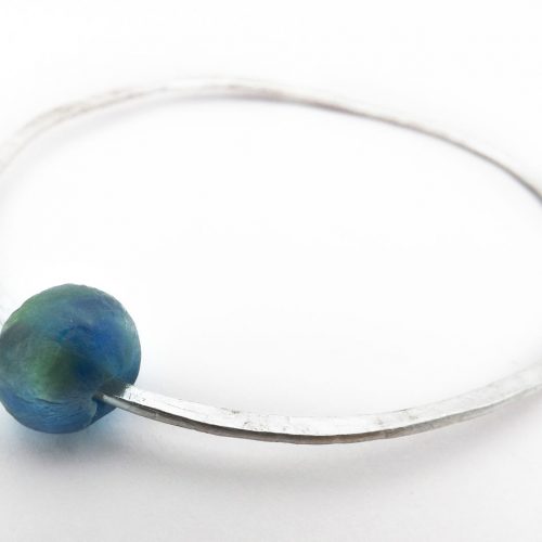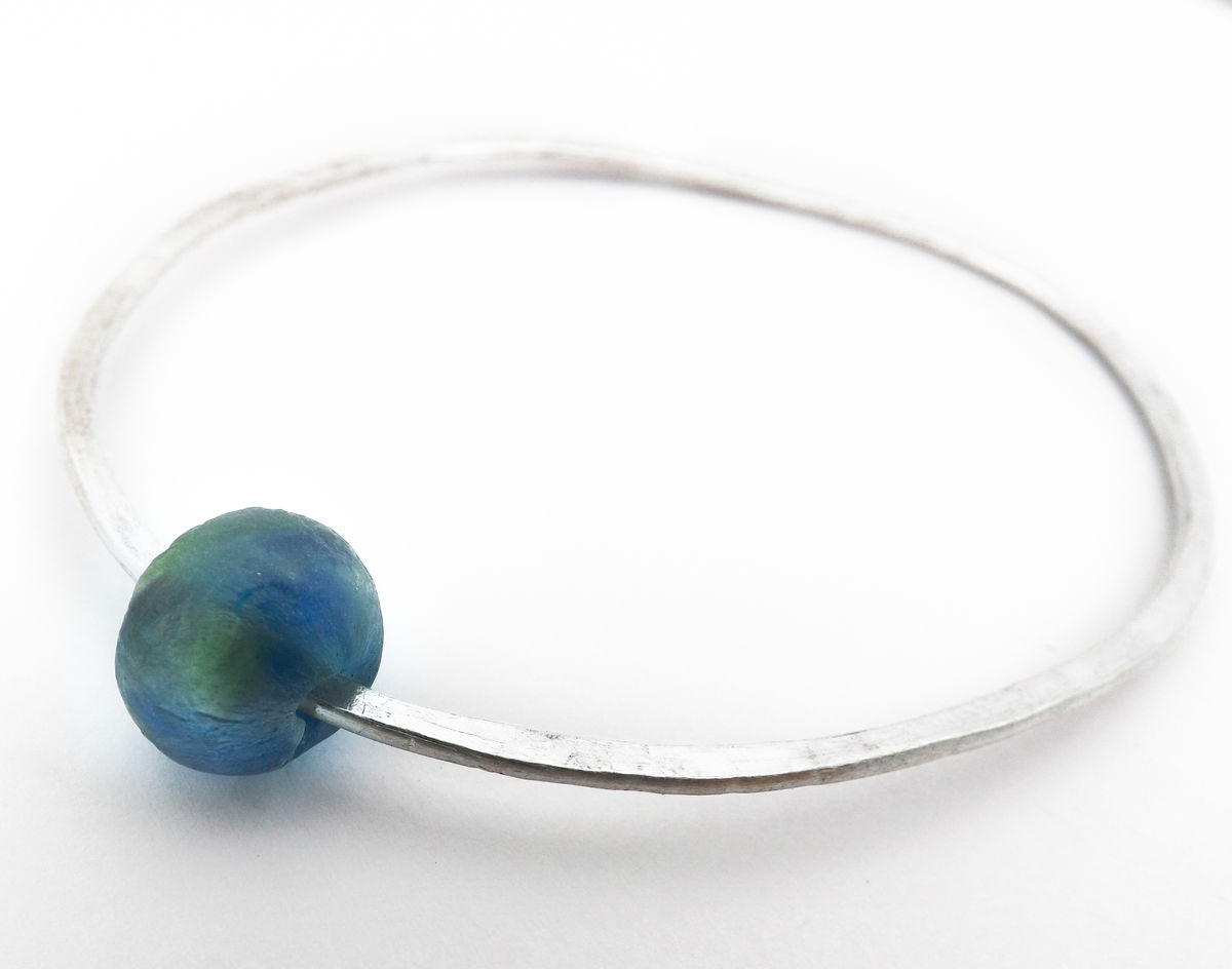 A gorgeous textured recycled bottle glass bead (around 10mm diamater) bought Fair-trade from Oklah Tetteh in Ghana; I’ve threaded it onto a sterling eco-silver hammered bangle, made in a pebble shape. Different beads are available, so please just choose your favourite colour, I can always send you extra images to help you decide. The beads are all handmade so will vary a bit in shape and colour, but that’s part of their beauty. If you’d like me to make the bangle to fit you exactly, please measure the exact size of your hand at it’s widest point, which is normally just below the base of your thumb. I can then add the right amount on to make the bangle to fit you.