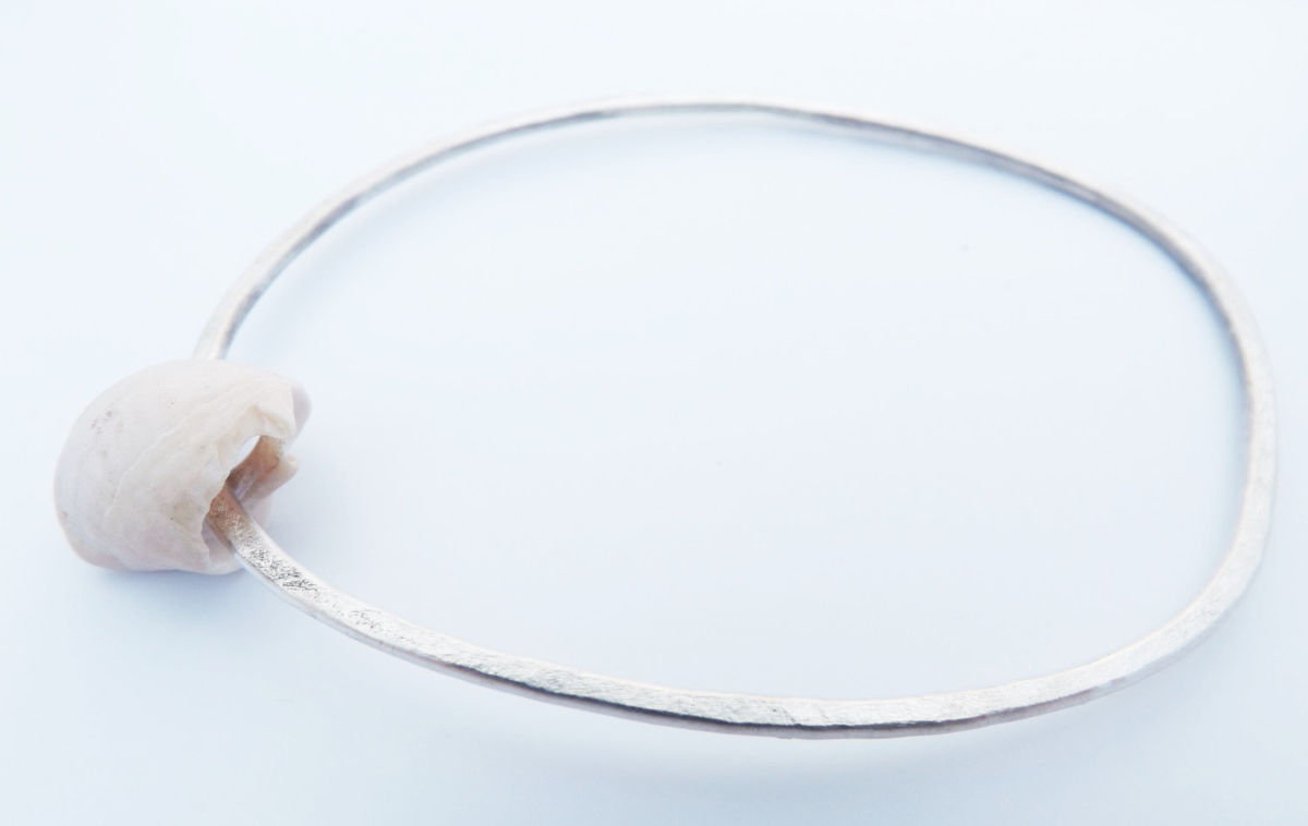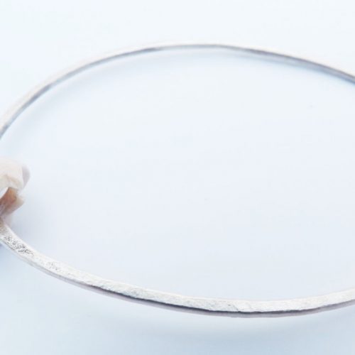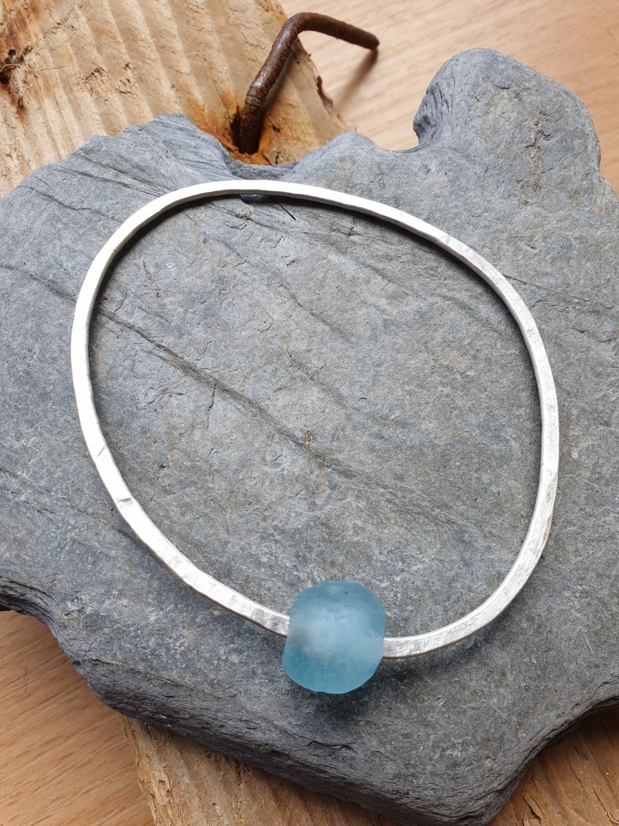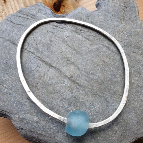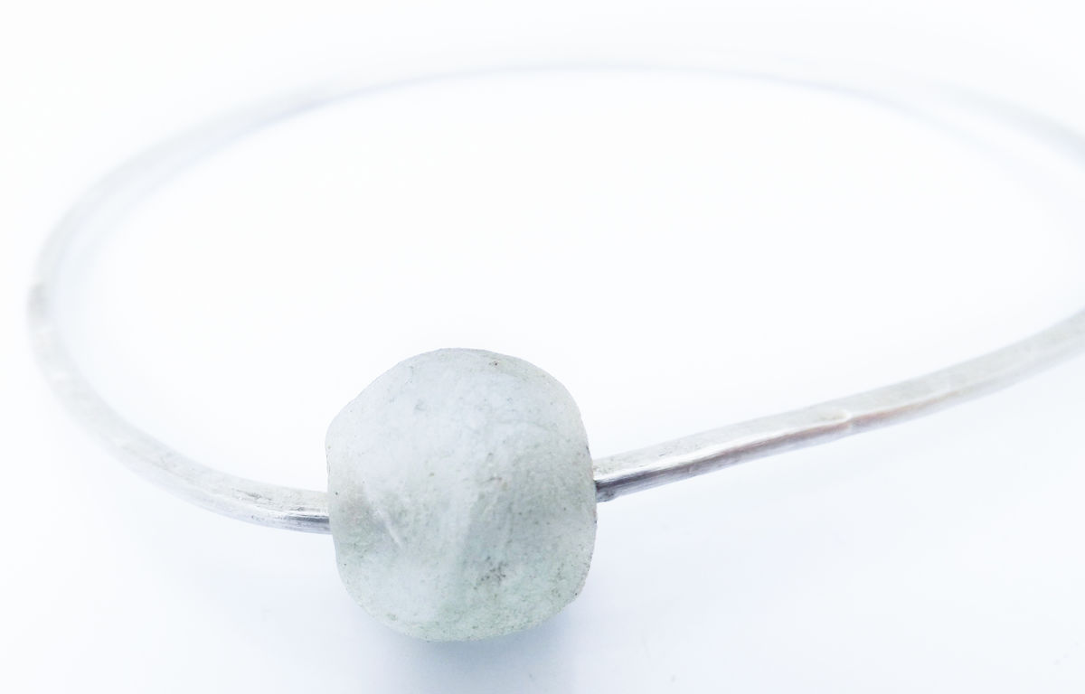 A gorgeous textured recycled bottle glass bead (around 10mm diamater) bought Fair-trade from Oklah Tetteh in Ghana; I’ve threaded it onto a sterling eco-silver hammered bangle, made in a pebble shape. Different beads are available, so please just choose your favourite colour, I can always send you extra images to help you decide. The beads are all handmade so will vary a bit in shape and colour, but that’s part of their beauty. If you’d like me to make the bangle to fit you exactly, please measure the exact size of your hand at it’s widest point, which is normally just below the base of your thumb. I can then add the right amount on to make the bangle to fit you.