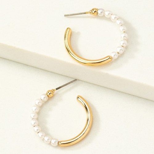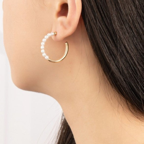 Elevate your elegance with these skinny hoop earrings featuring a sophisticated half pearl detail. Perfect for adding a touch of refinement to any outfit, these earrings are ideal for both casual and formal occasions. product details1″Post backAlloyAcrylic pearlShiny gold plating