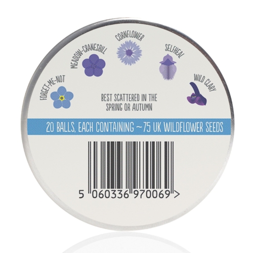 Each tin contains 20 seed balls, enough to cover 1 metre square in a garden or 3 to 5 medium sized pots (leave at least 10cm between the balls). Each ball contains approximately 75 seeds from all-blue-flowering native wildflower mix bursting with Cornflowers, Forget-me-nots, Meadow cranesbill, Self Heal and Wild Clary. Best scattered in Spring or Autumn.