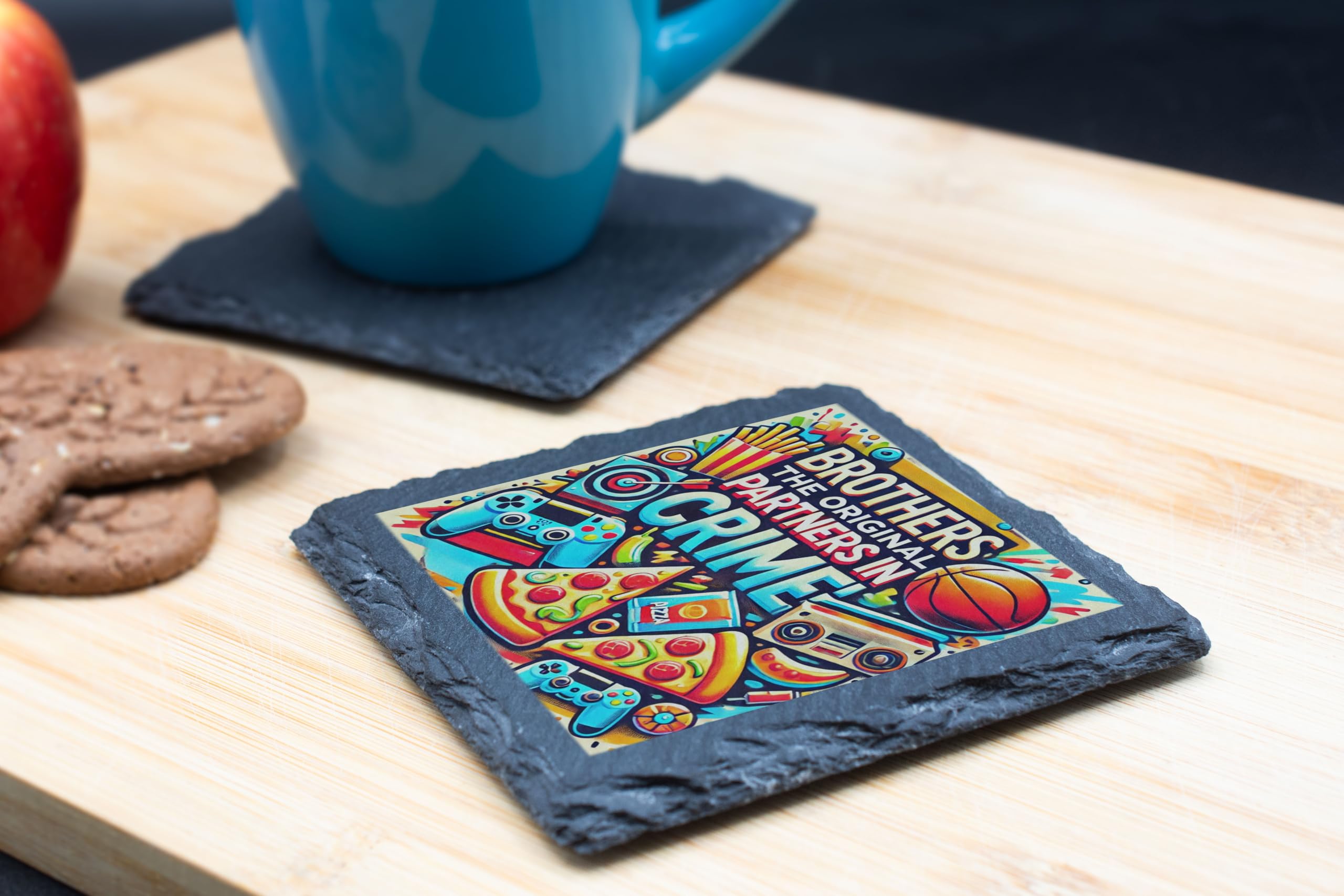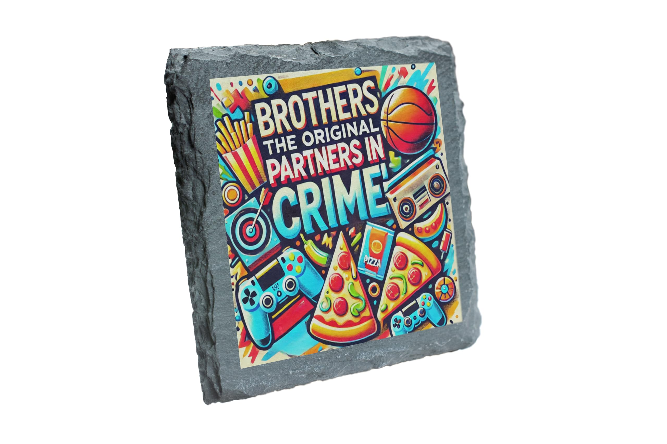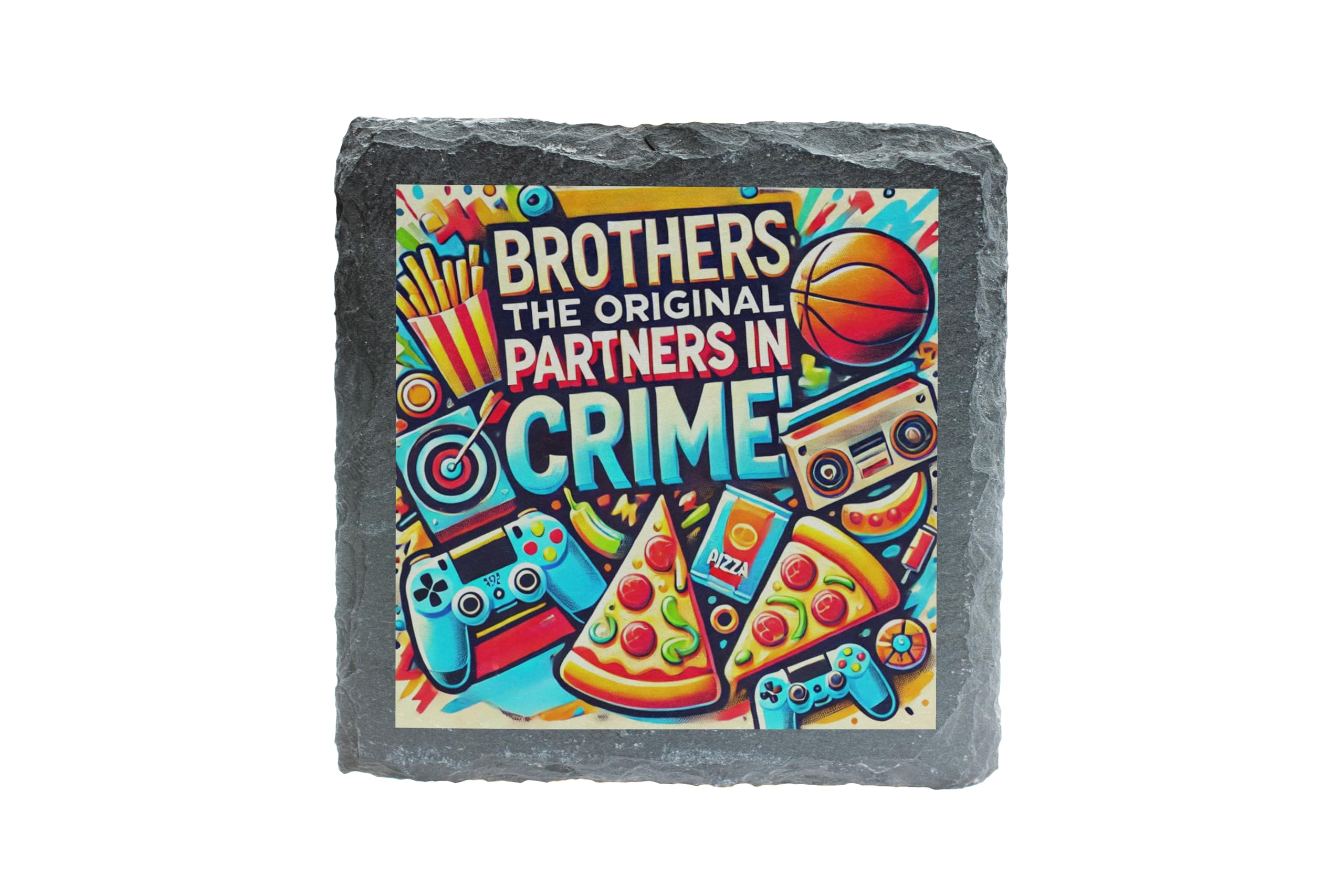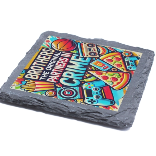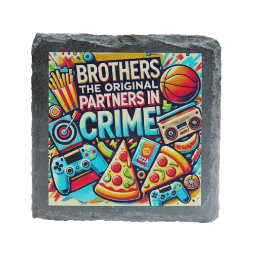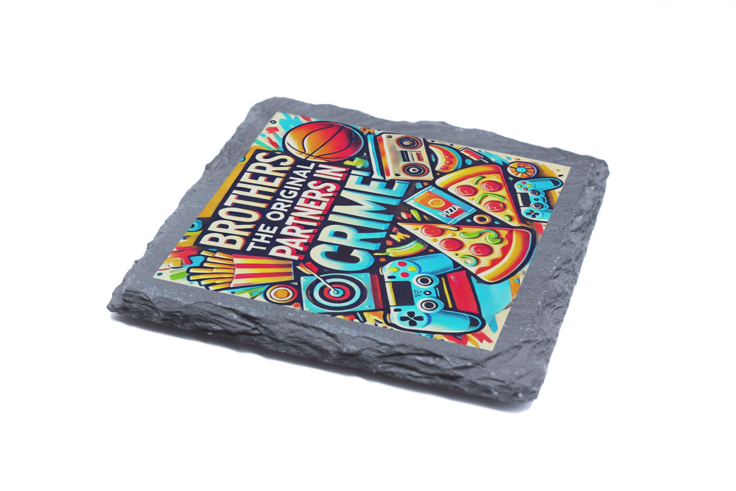 Celebrate the joy of brotherhood with this eye-catching slate coaster featuring the phrase, “Brothers: The Original Partners in Crime.” The vibrant design showcases all the essentials of brotherly fun: gaming, sports, snacks, and music. Made from premium natural slate, this coaster is not only functional but also a stylish addition to any room. Whether you’re gifting it to your sibling or using it to protect your furniture during game nights, this coaster is a playful reminder of the unique and cherished bond between brothers. Perfect for any occasion, it’s a thoughtful way to show your love and appreciation. Bold & Vibrant Design: Features an energetic theme with gaming controllers, basketballs, pizza slices, and more, highlighting the fun bond between brothers. Durable Slate Material: Crafted from high-quality, natural slate for long-lasting use with a rustic finish. Perfect Size for Drinks: Approximately 10 x 10 cm, ideal for protecting your furniture from spills and scratches. Celebrates Brotherhood: A playful and heartfelt addition to your home or a perfect gift for your favorite sibling. Great for Any Occasion: Ideal for birthdays, holidays, or just because â a tribute to the unbreakable bond of brotherhood.