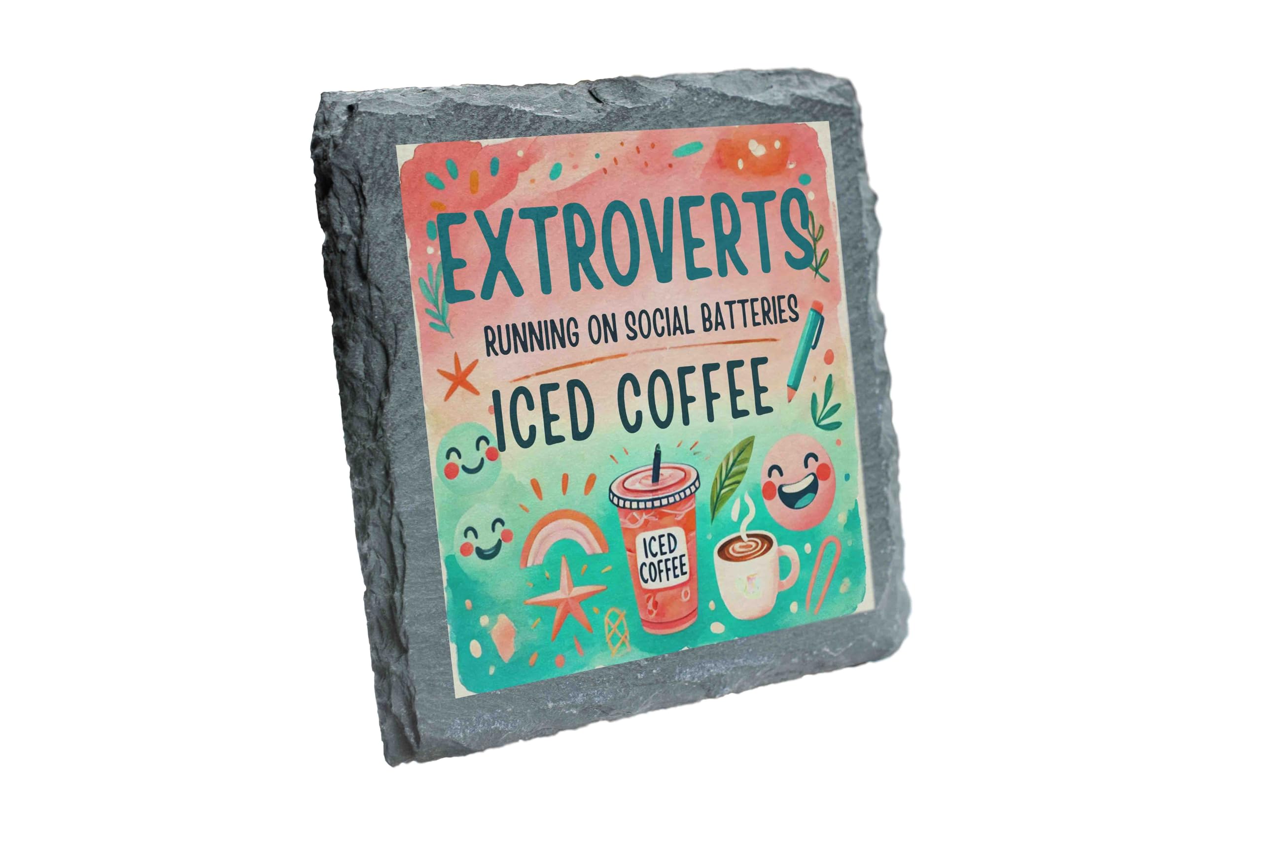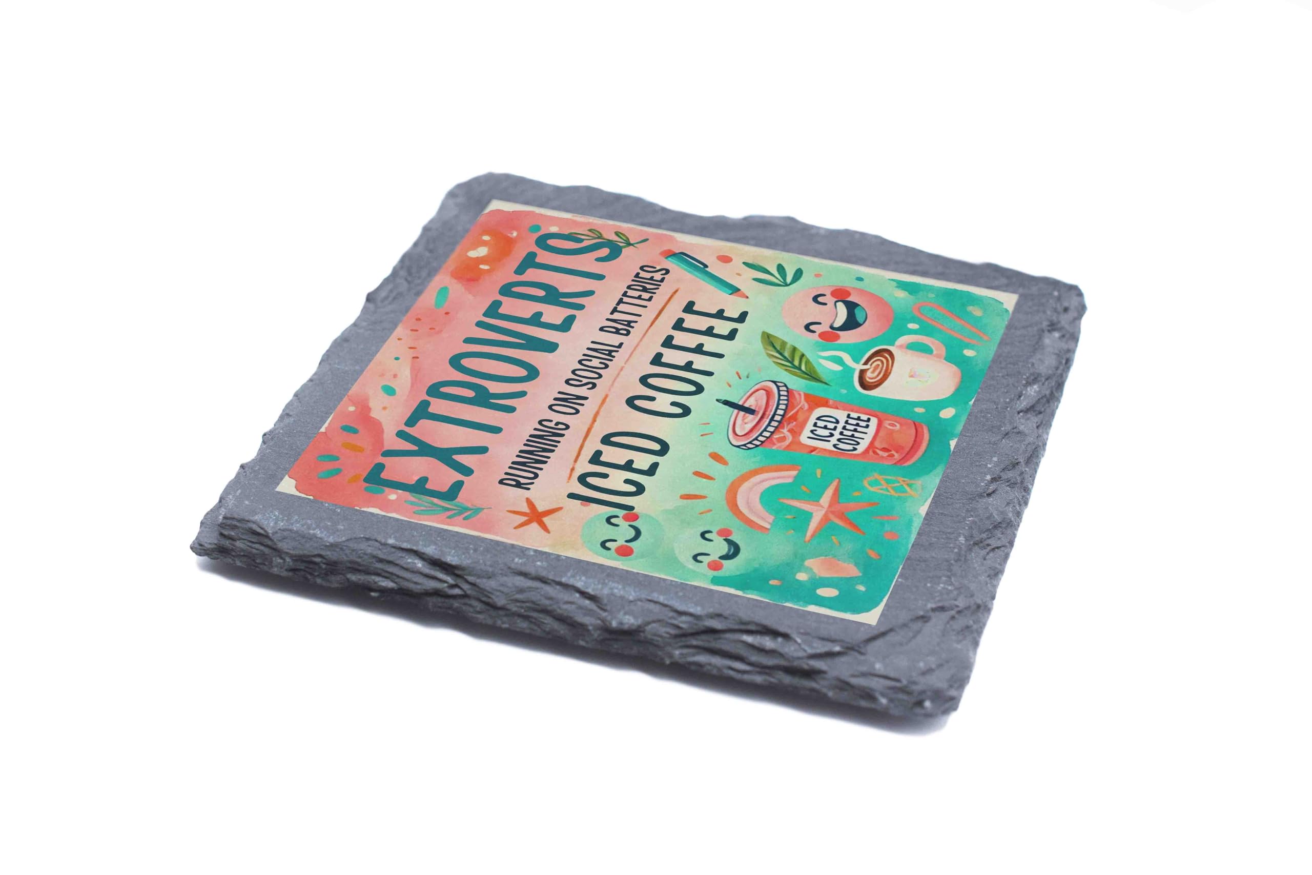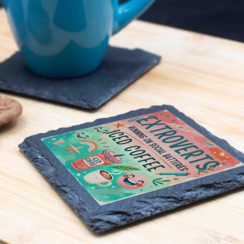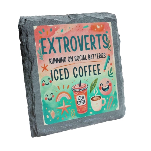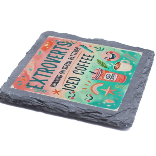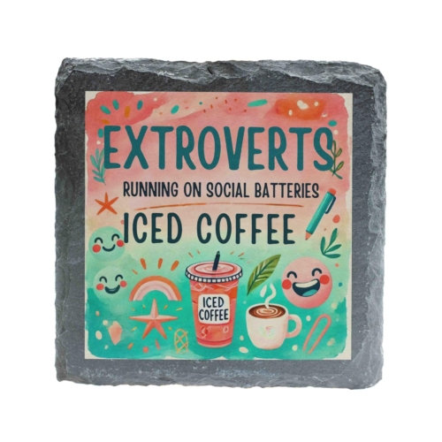 Brighten up your day and your coffee table with this vibrant slate coaster! Showcasing the humorous and relatable phrase, “Extroverts: Running on Social Batteries and Iced Coffee,” it?s a perfect addition for lively spirits and caffeine enthusiasts. Made from natural slate, this durable coaster protects surfaces from stains while adding charm to any home or office setting. Its unique and playful design makes it an excellent gift for friends, coworkers, or family members who love iced coffee and socializing. Lively Design: Features vibrant, colorful artwork with playful text for extroverts and coffee lovers. Premium Slate Material: Crafted from natural slate with a textured finish, combining durability and style. Functional & Decorative: Protects surfaces from spills while adding a burst of personality to your space. Perfect Gift: A great choice for coffee enthusiasts, extroverts, or anyone with a love for fun decor. Eco-Friendly Packaging: Thoughtfully packaged with environmentally sustainable materials for safe delivery.