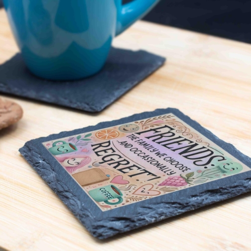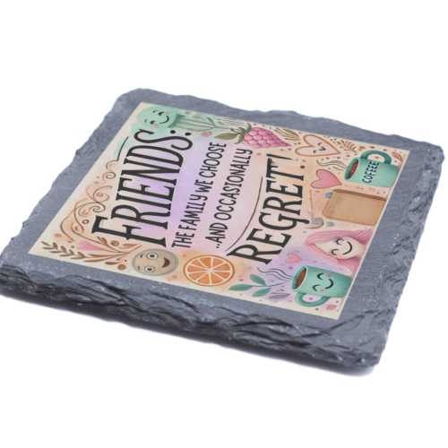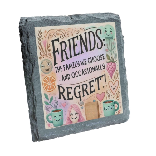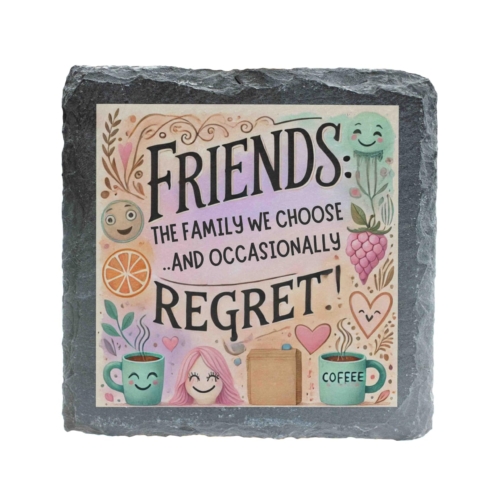 Celebrate the ups, downs, and laughter of friendship with this delightful slate coaster. Featuring the witty phrase, “Friends: The Family We Choose and Occasionally Regret,” this coaster is a nod to those unforgettable moments with your chosen family. Crafted from premium slate with a protective felt backing, this coaster combines style and functionality. Its vibrant and playful design, complete with charming graphics, makes it a wonderful gift for birthdays, holidays, or just because. Keep your surfaces safe and your sense of humor intact with this delightful friendship-themed accessory! Playful Friendship Design: Features the humorous phrase, “Friends: The Family We Choose and Occasionally Regret,” perfect for celebrating your quirky friendships. Durable Slate Material: Made from genuine slate with a rustic texture, adding a touch of charm to any tabletop. Charming Illustrations: Adorned with colorful, cheerful graphics, including coffee mugs, hearts, and vibrant accents. Protective Backing: Felt backing prevents surface scratches while ensuring stability on any surface. Great Gift Idea: An ideal gift for best friends, coworkers, or as a lighthearted addition to any gathering.