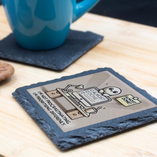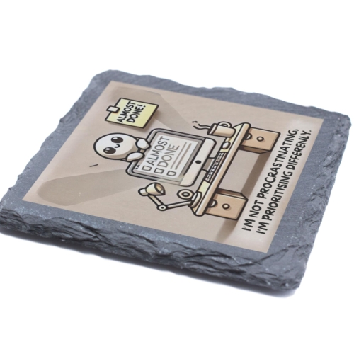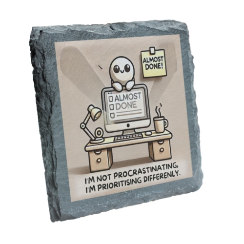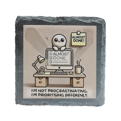 Add a touch of humor to your desk or workspace with this quirky slate coaster, featuring the phrase “I?m Not Procrastinating, I?m Prioritising Differently” paired with a fun cartoon design. Perfect for professionals, students, or anyone with a sense of humor about their work habits, this coaster brings a smile while protecting your surfaces. Crafted from high-quality natural slate, this coaster offers excellent durability and a rustic aesthetic that suits both modern and classic office environments. Its functionality ensures your desk stays safe from spills, scratches, and heat, while its amusing design lightens the mood during busy days. This slate coaster makes a fantastic gift for coworkers, friends, or family members who enjoy clever office humor. Whether used in the office, at home, or in a study, it?s a unique and practical accessory that?s sure to spark conversation. Keep your workspace organized and your spirits high with this fun and functional coaster! Witty Design: Features the humorous phrase “Iâm Not Procrastinating, Iâm Prioritising Differently” with a playful cartoon illustration. Durable Slate Material: Made from natural slate, combining functionality with a rustic and professional touch. Practical and Stylish: Protects surfaces from spills, heat, and scratches while adding humor to your workspace. Ideal Gift for Coworkers and Professionals: A perfect gift for colleagues, friends, or anyone who appreciates office humor. Easy to Clean: Low-maintenance design; simply wipe with a damp cloth to keep it looking great.