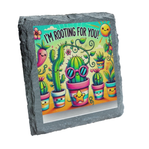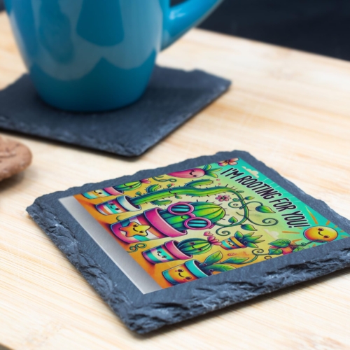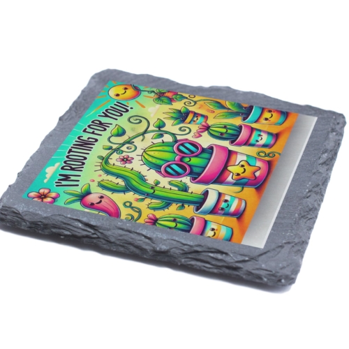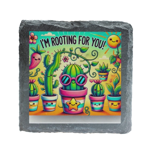 Add a dose of positivity to your table with this charming slate coaster. Featuring an adorable array of smiling potted plants and cacti, paired with the uplifting message, “I’m Rooting For You!”, this coaster is designed to bring joy and functionality into your home. Crafted from durable natural slate, this coaster not only protects your surfaces but also adds a touch of whimsy to any room. Its vibrant design is perfect for brightening up coffee tables, desks, or dining areas, making it an excellent conversation starter. This delightful coaster also makes a thoughtful gift for friends, family, or coworkers who appreciate plants and positivity. Whether for a special occasion or just to spread cheer, it’s a practical and heartwarming choice. Keep your surfaces safe and your spirits high with this unique slate coaster! Cheerful Artwork: Features a lively illustration of smiling potted plants and cacti with the encouraging phrase, “I’m Rooting For You!” Natural Slate Material: Handcrafted from high-quality natural slate for a rustic yet durable look, perfect for everyday use. Functional and Decorative: Protects surfaces from spills and scratches while adding a splash of color and positivity to your space. Perfect Gift: An ideal present for plant lovers, gardeners, or anyone in need of a little encouragement. Easy Maintenance: Wipe clean with a damp cloth for hassle-free upkeep.