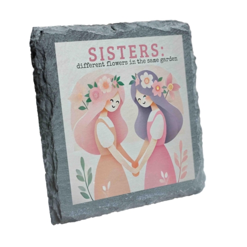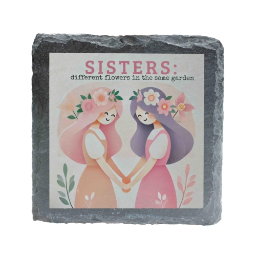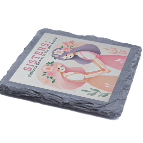 Celebrate the beauty of sisterhood with this elegantly designed slate coaster. With its heartwarming quote and pastel floral design, it serves as both a practical and sentimental piece. Crafted from durable slate, it protects your surfaces while adding a touch of love to your home. Perfect for gifting on birthdays, holidays, or just because, this coaster is a meaningful way to honor the special bond between sisters. Add it to your home d?cor or gift it to a beloved sister to show how much you care. Heartfelt Sisterly Design: Features a charming illustration of two sisters with the touching message, “Sisters: Different Flowers in the Same Garden.” Natural Slate Material: Made from premium quality slate for a robust, earthy aesthetic. Protects Your Furniture: Provides a protective layer for tables and countertops from moisture and scratches. Ideal Sister Gift: A perfect sentimental gift for celebrating sisterhood and cherished memories. Versatile Use: Great for coffee tables, desks, or as a decorative touch to any space.
