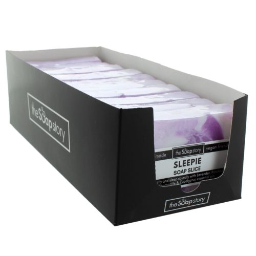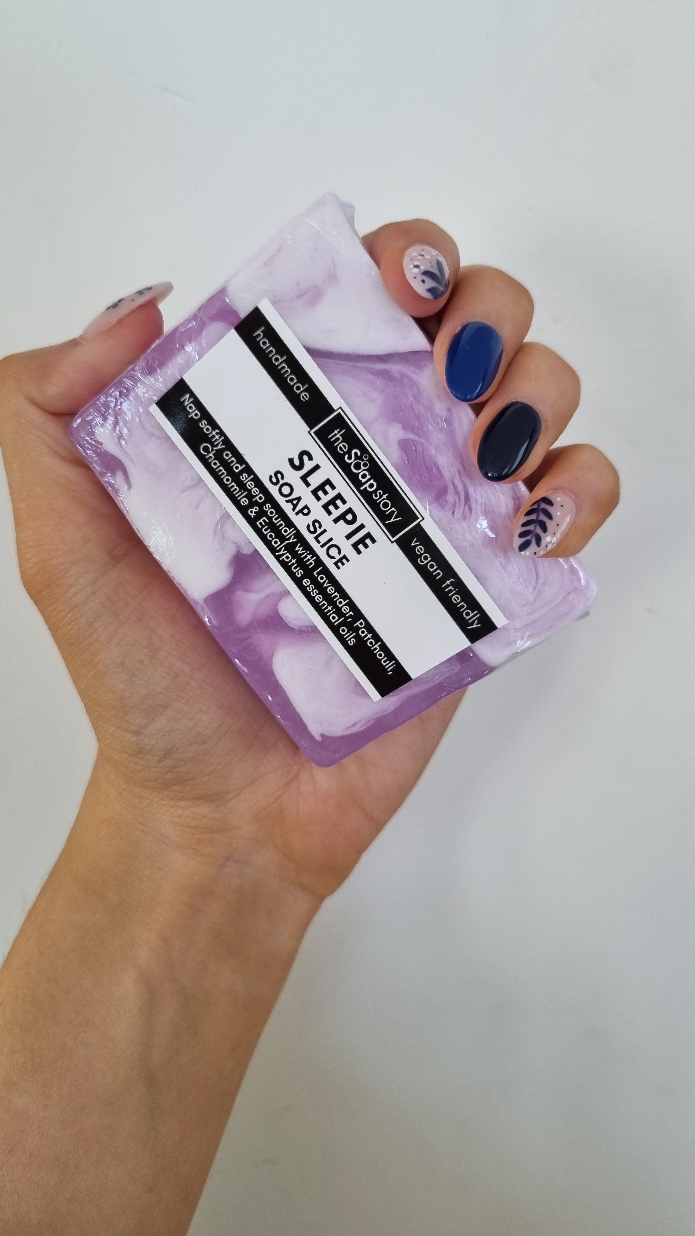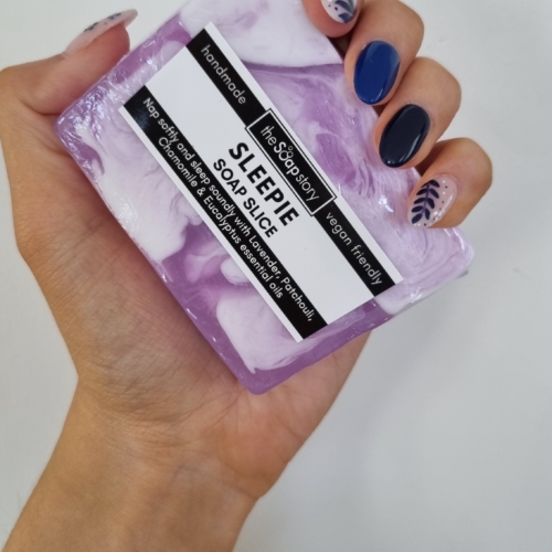 Our Sleepie Soap Slice has fresh, herbal lavender fragrance that contains Lavender, Chamomile, Patchouli , Listea Cubea, Eucalyptus and Petigrain essential oils,with a touch of soft musks for just that little bit more relaxation.