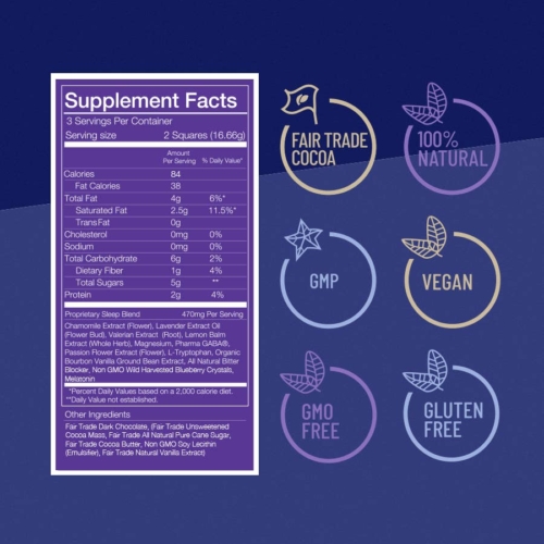 Functional Dark Chocolate formulated to address the issues associated with Sleep. Clinically researched ingredients supported with vitamins, herbs & minerals, delivered in delicious dark chocolate.Weight Per Unit: 1.75oz/50g.Product Dimensions: 6.38 in (height) x 3.50 in (width) x 0.12 in (depth)