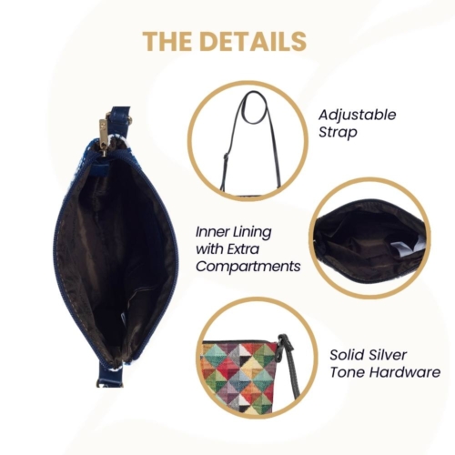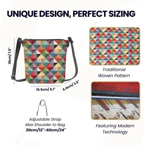 FABRIC COMPOSITION: 100% Polyester.EASY CARE: Clean it with a damp cloth. Do not soak in water.Enjoy your day with branded sling bags by Signare.[custom_html]UNIQUE LIFESTYLE DESIGN: This contemporary design from Signare is made up of a multi-colored combination of triangular vectors; utilizing tapestry technology, it creates a stylish pattern that is both hip and trendy. PRODUCT DESCRIPTION: If you fancy a very casual and compact bag, this tapestry fabric sling bag is for you. It is ideal for holding your travel documents when on holiday Wear it on its own or as an add-on to your other handbag Fastened with a zip top to protect your goods Webbing strap is adjustable and promotes comfortable travel. Features an inside slip pocket and lined with a patterned nylon Can be worn across the body or on your shoulder These fashionable sling bags are made from Signare tapestry woven fabrics Size approx. W 6.1 x H 7.5 x D 2.5 inches – Weight 0.3 lb [/custom_html]
