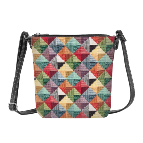 FABRIC COMPOSITION: 100% Polyester.EASY CARE: Clean it with a damp cloth. Do not soak in water.Enjoy your day with branded sling bags by Signare.[custom_html]UNIQUE LIFESTYLE DESIGN: This contemporary design from Signare is made up of a multi-colored combination of triangular vectors; utilizing tapestry technology, it creates a stylish pattern that is both hip and trendy. PRODUCT DESCRIPTION: If you fancy a very casual and compact bag, this tapestry fabric sling bag is for you. It is ideal for holding your travel documents when on holiday Wear it on its own or as an add-on to your other handbag Fastened with a zip top to protect your goods Webbing strap is adjustable and promotes comfortable travel. Features an inside slip pocket and lined with a patterned nylon Can be worn across the body or on your shoulder These fashionable sling bags are made from Signare tapestry woven fabrics Size approx. W 6.1 x H 7.5 x D 2.5 inches – Weight 0.3 lb [/custom_html]