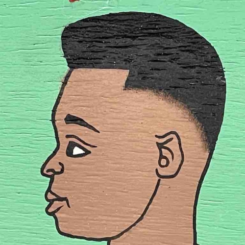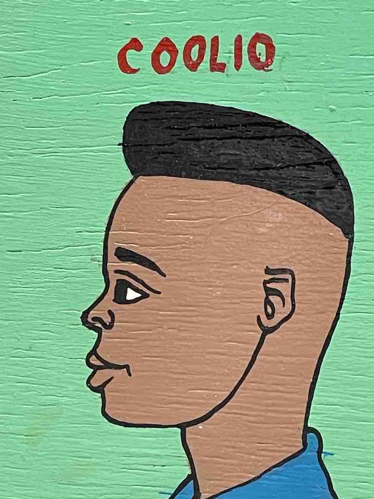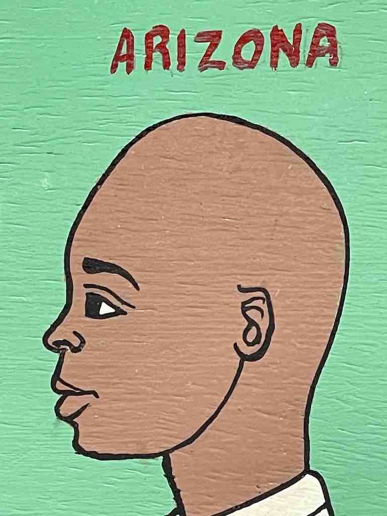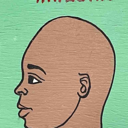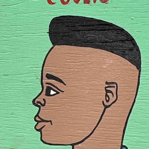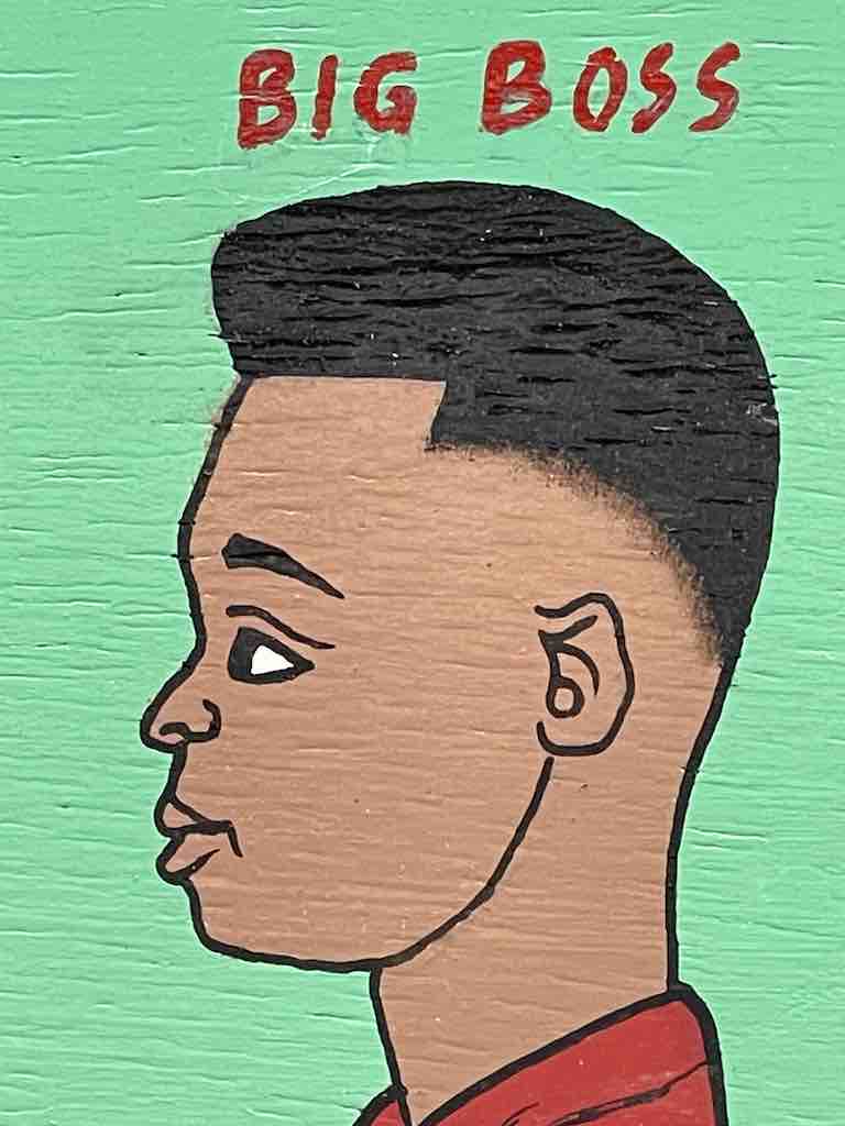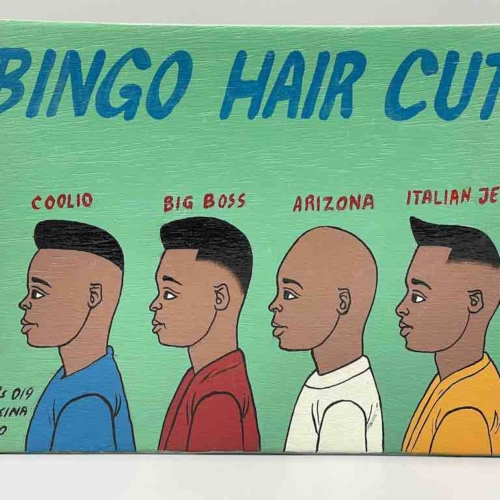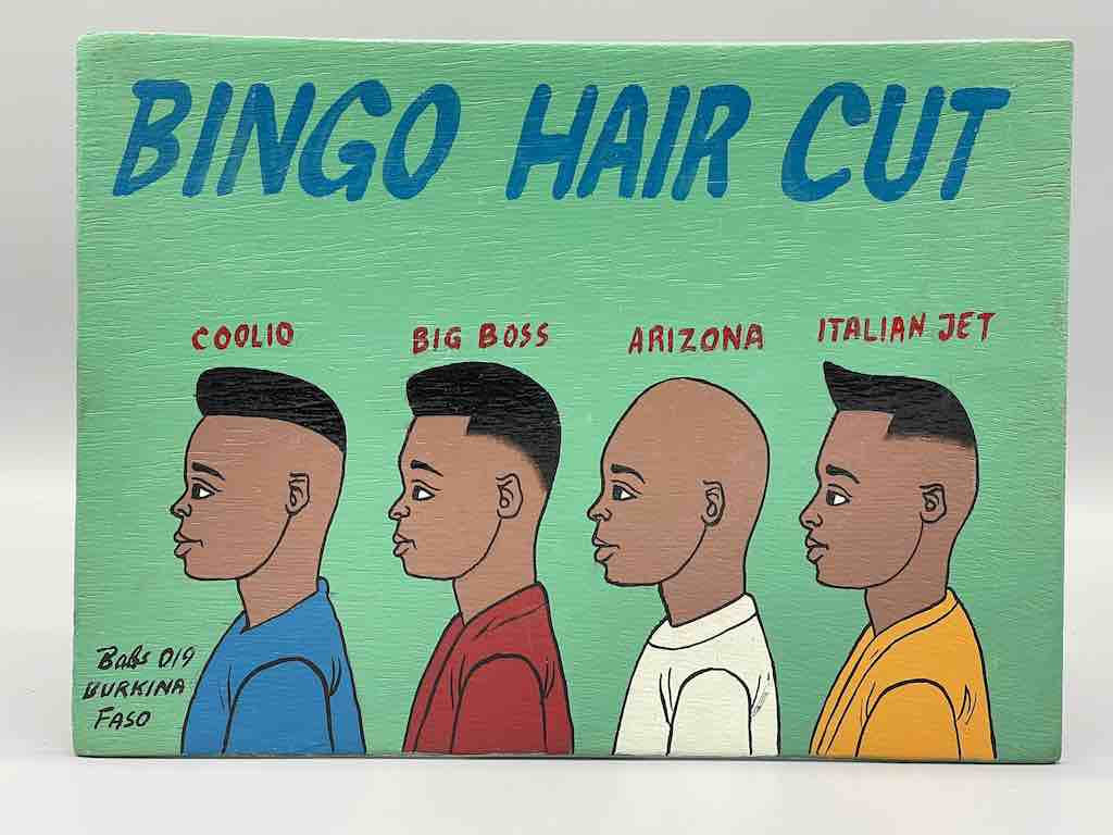 This sign was painted by an artist – who calls himself “Babs” in Ouagadougou, Burkina Faso. I met him at an exhibition in Ouagadougou and commissioned him to paint a large variety of this same style and size of sign, all his own creations. It measures 11 x 8″ (122 x 40.6 cm) and is painted on 1/16″ thick single ply wood. The names of the hairstyles seem to be his own inventions as well. Babs, like everyone in Burkina Faso, speaks French, the country’s official language, so many of his titles are in French although he sometimes uses English.