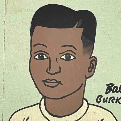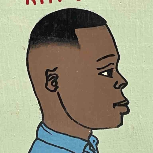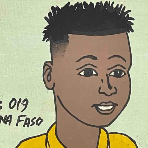 This sign was painted by an artist – who calls himself “Babs” in Ouagadougou, Burkina Faso. I met him at an exhibition in Ouagadougou and commissioned him to paint a large variety of this same style and size of sign, all his own creations. It measures 11 x 8″ (122 x 40.6 cm) and is painted on 1/16″ thick single ply wood. The names of the hairstyles seem to be his own inventions as well. Babs, like everyone in Burkina Faso, speaks French, the country’s official language, so many of his titles are in French although he sometimes uses English.