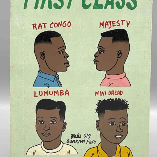 This sign was painted by an artist – who calls himself “Babs” in Ouagadougou, Burkina Faso. I met him at an exhibition in Ouagadougou and commissioned him to paint a large variety of this same style and size of sign, all his own creations. It measures 11 x 8″ (122 x 40.6 cm) and is painted on 1/16″ thick single ply wood. The names of the hairstyles seem to be his own inventions as well. Babs, like everyone in Burkina Faso, speaks French, the country’s official language, so many of his titles are in French although he sometimes uses English.