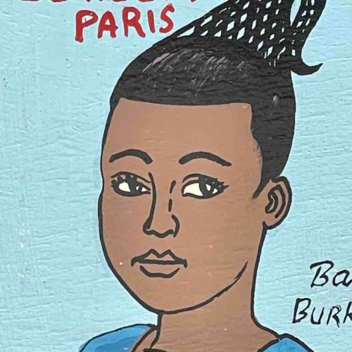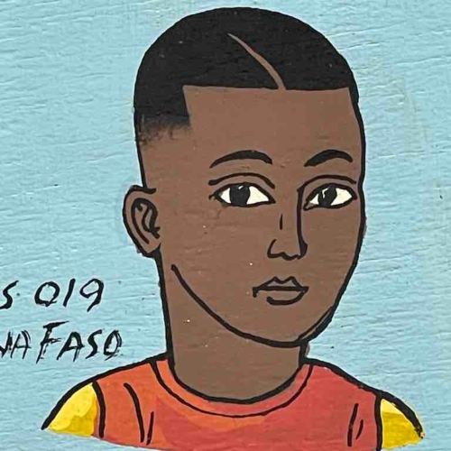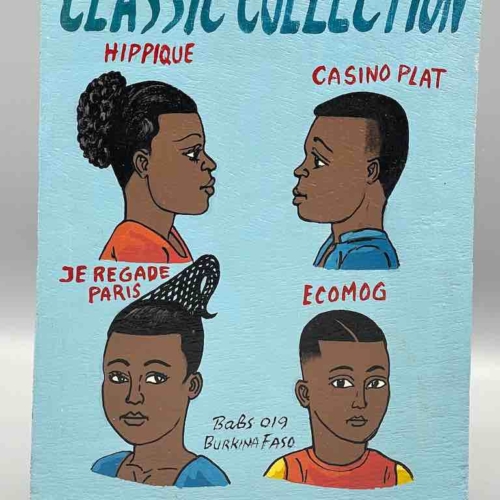 This sign was painted by an artist – who calls himself “Babs” in Ouagadougou, Burkina Faso. I met him at an exhibition in Ouagadougou and commissioned him to paint a large variety of this same style and size of sign, all his own creations. It measures 11 x 8″ (122 x 40.6 cm) and is painted on 1/16″ thick single ply wood. The names of the hairstyles seem to be his own inventions as well. Babs, like everyone in Burkina Faso, speaks French, the country’s official language, so many of his titles are in French although he sometimes uses English.