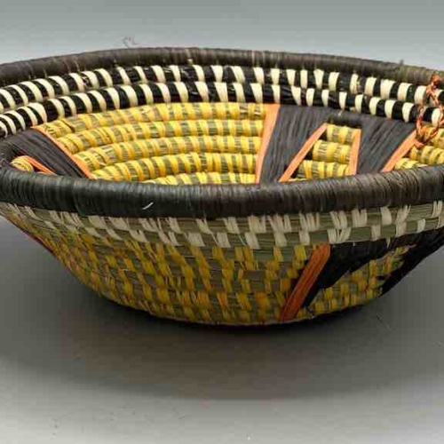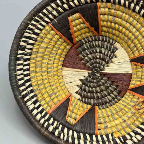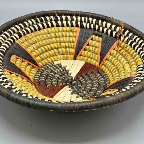 These Batwa baskets incorporate techniques not found in any other African basket. To the coiled grass construction a supplementary raffia woven design is added. The Batwa – the Twa people, a “pygmy” people – live in the border area of southwestern Uganda, northwestern Rwanda and eastern Congo, in the area of the Ruwenzori Mountains, in the Bwindi Impenetrable Forest. They live among a native gorilla population just like we live among whitetail deer. 2 1/4 x 9 5/8” diameter (6 x 25 cm)