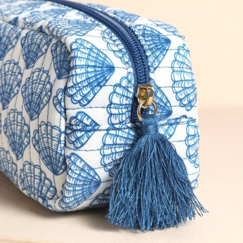 Navy and white makeup bag with a seaside themeDecorative shell and tassel details for a coastal vibeIdeal for customers to organise make-up or travel essentialsA great addition to a collection of summer holiday accessoriesDimensions: width 18cm x height 14cm x depth 8cmMade from: polyester, metal