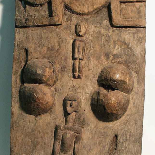17 x 31″ (43 x 79 cm) This “door” is more a window than a door. It closes an opening to the adobe granaries in which the Dogon store their grain. The figures protect the grain inside from mold, insects and all other threats.