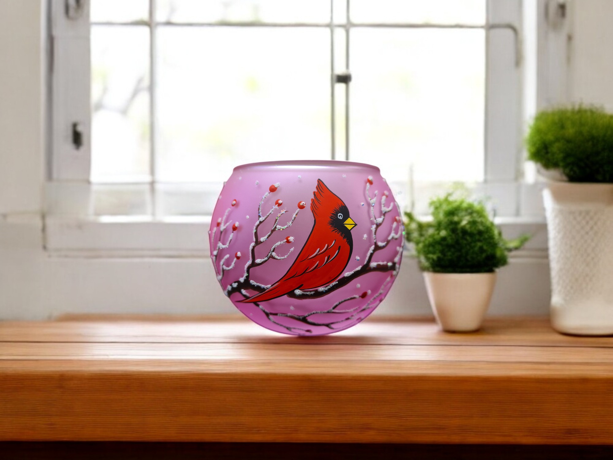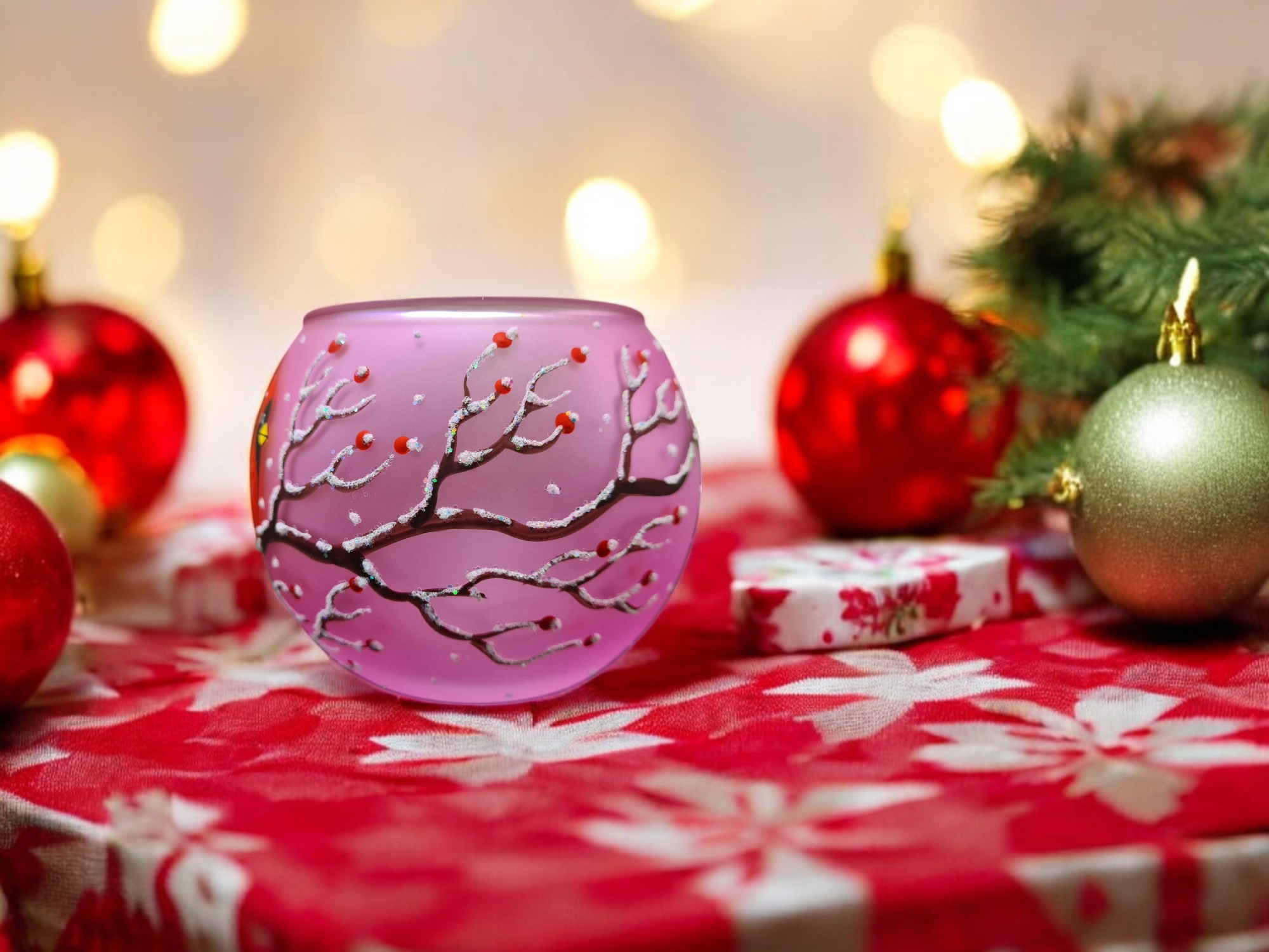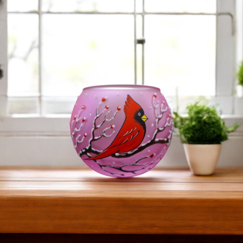 Small Pink Glass Candle Holder, Hand Crafted in Ukraine, Cardinal, Wonderful Year Round