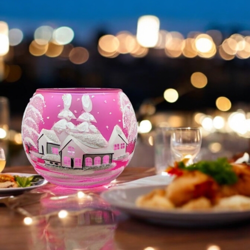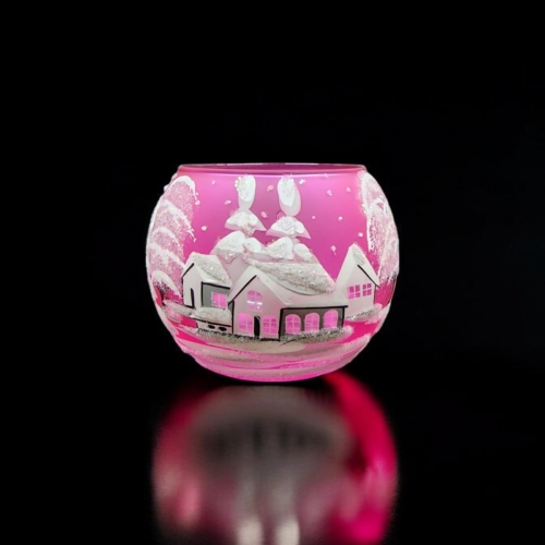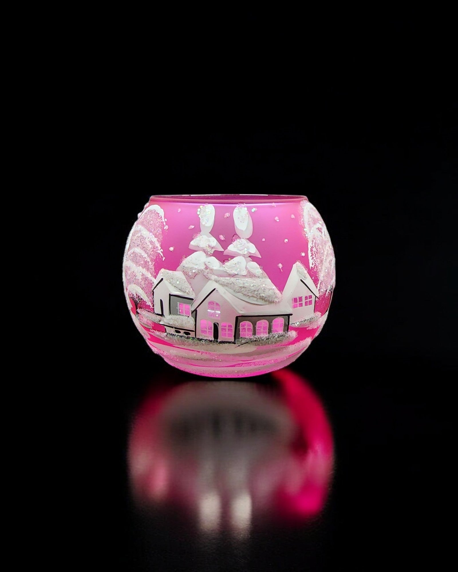 Small Pink Glass Candle Holder, Hand Crafted in Ukraine, White Cabin Winter Wonderland, Wonderful Year Round